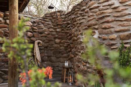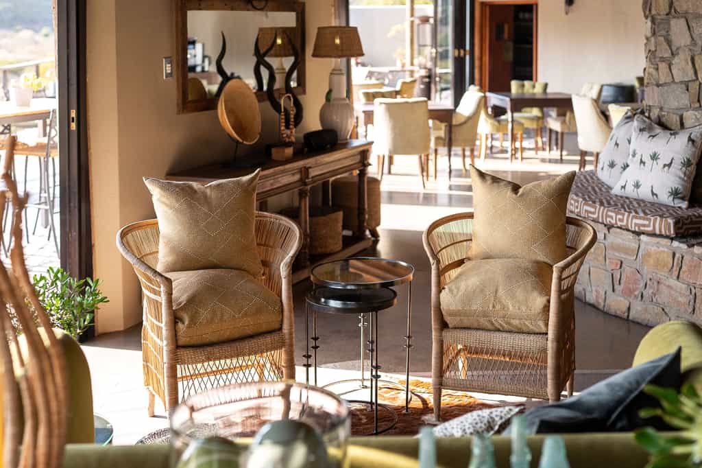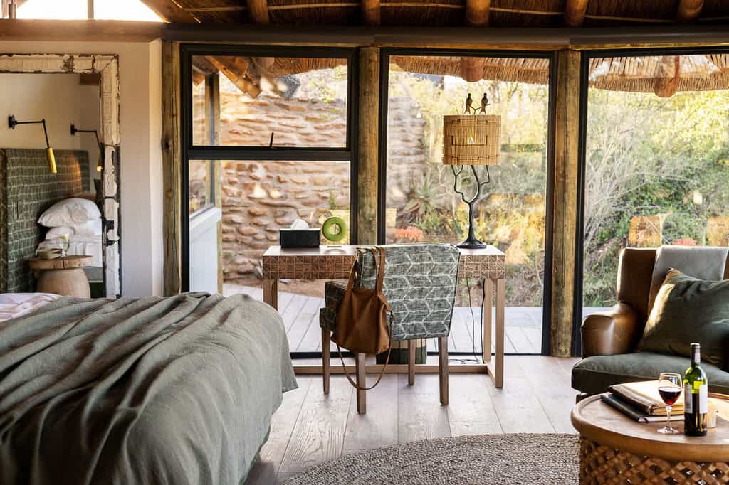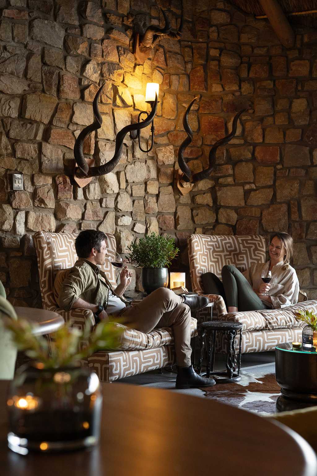 The guest areas are spacious and free-flowing, separated only by a double-sided fireplace, creating a sophisticated but relaxing environment. The decor is tranquil, with neutral colours and African touches that don't detract from the wilderness views. Beyond the sliding glass doors is a generous wraparound viewing deck with comfortable chairs that invite you to settle back to observe the bush and its inhabitants. There is a library, a gift shop, a wine cellar and a fire-lit boma for the occasional communal meal.