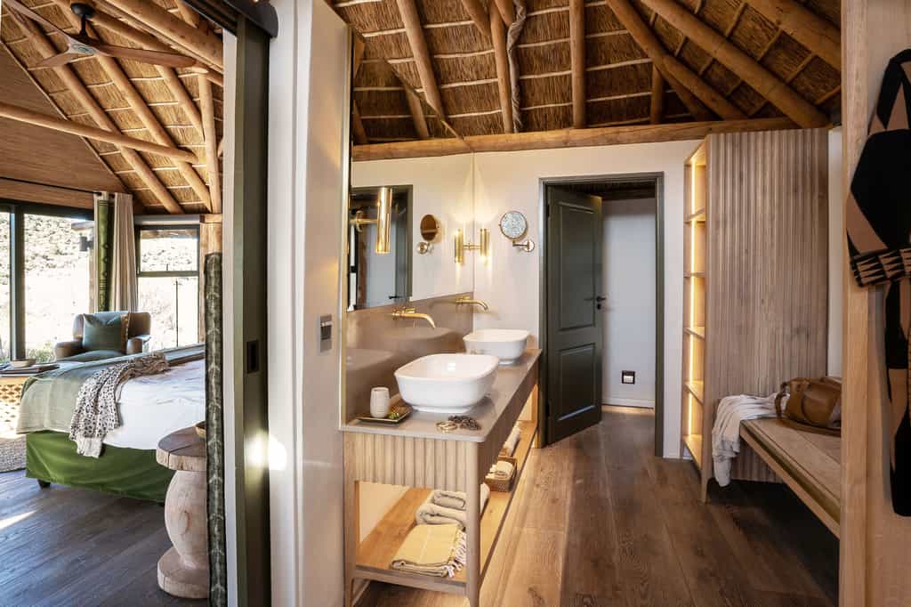 Nine luxurious thatched suites, beautifully furnished in neutral colours, feature fold-back doors to allow guests to soak up the striking surroundings. Each suite has a large bed, deep-seated chairs, an en-suite bathroom with indoor and outdoor showers, air-conditioning, hairdryer, personal minibar and a covered wooden deck with plunge pool and recliners to make sure you have a relaxing stay.