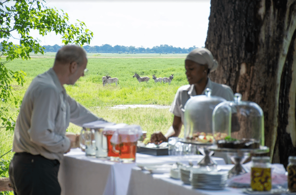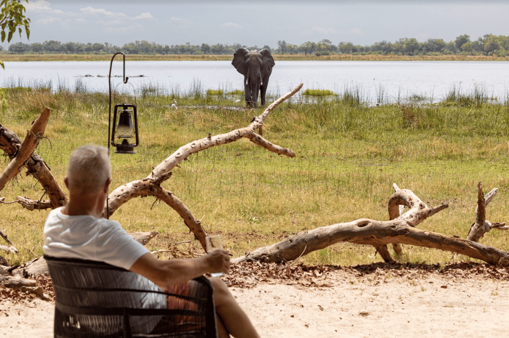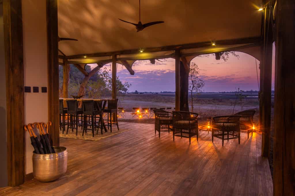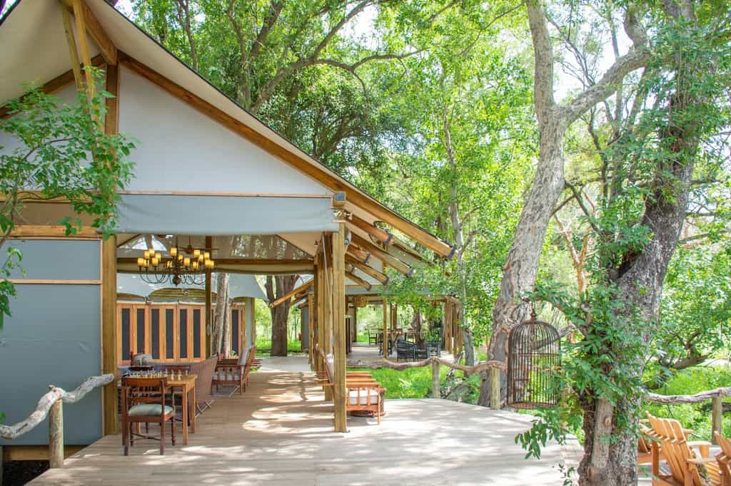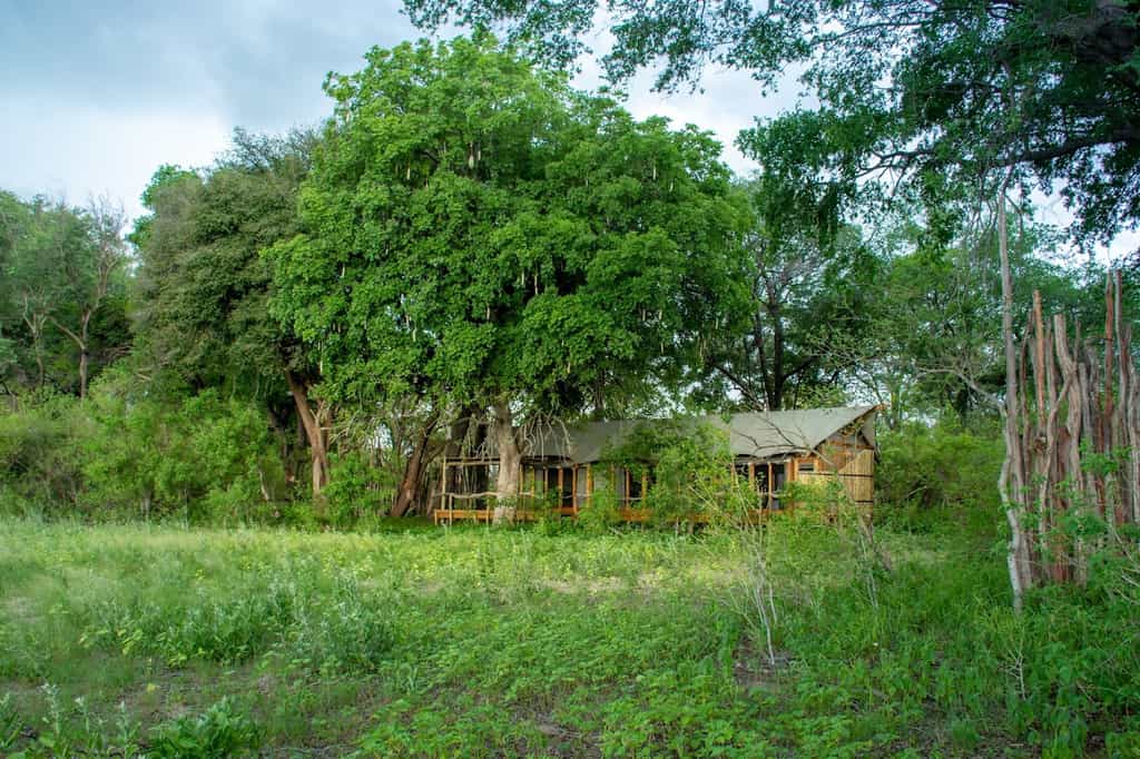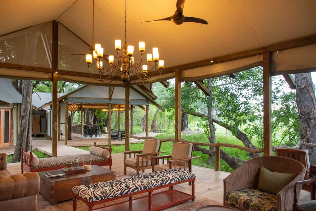 Set amongst leadwood, mangosteen and knobthorn trees, the main area is nicely shaded and has a warm, down-to-earth atmosphere. The bar and lounge area is a lovely place to unwind between activities; the nearby curio shop stocks local crafts and souvenirs for the retail-inclined. Along with the adjoining thatched dining room, this elevated central area has a clear view of the lagoon. The heart of the camp though, is the fireplace in the sand, around which early morning breakfast and evening drinks are served.