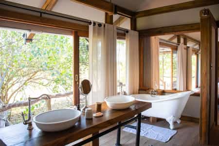 There are eight tents well spaced between the evergreen feverberries and mangosteens, each with an elevated view of the surrounding floodplain and lagoon. The tents are simple, yet comfortable with a large double bed and an en-suite bathroom, complete with an open-air shower. The honeymoon tent also has an outdoor bathtub. Each tent has a small veranda with a couple of deck chairs that links to the bedroom by a large mesh sliding door, maximising space and light.