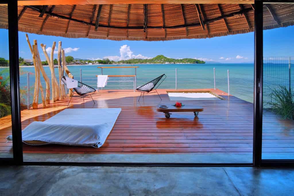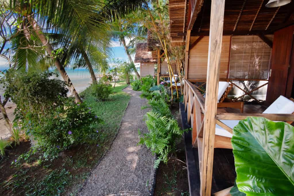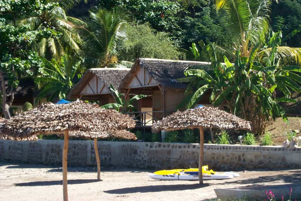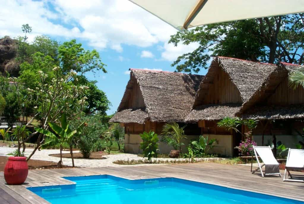 The resort has a collection of luxury bungalows and lodges, the latter set on the seafront or in shady private gardens. Each room has been thoughtfully decorated by the lauded Frederique Glainereau in dusky-blue hues, rosewood furnishings, and splashes of hot pink flowers. They are all kept cool by clever ravinala roofs and ceiling fans and open out onto a spacious deck, some with a sunken hammock and sun bed. The bathrooms have a rustic elegance but well-appointed amenities.