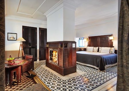 Gleaming Moroccan floors, ornate wooden doors, and leather foot poufs all bring a classic feel to each room. With a King-sized bed and dark wood furnishings, the rooms are comfortable and well-appointed. The larger suites also have a central fireplace, which leads into the sitting area. Done in pristine marble, the bathrooms have a walk-in shower and double basins, and some have a deep tub. While each room is spacious and private, the Family Suite has two en-suite bedrooms and a large lounge.