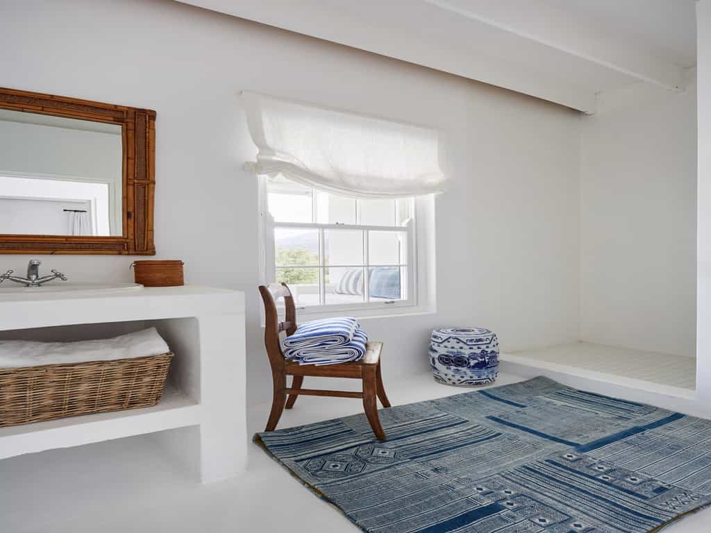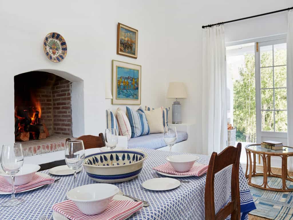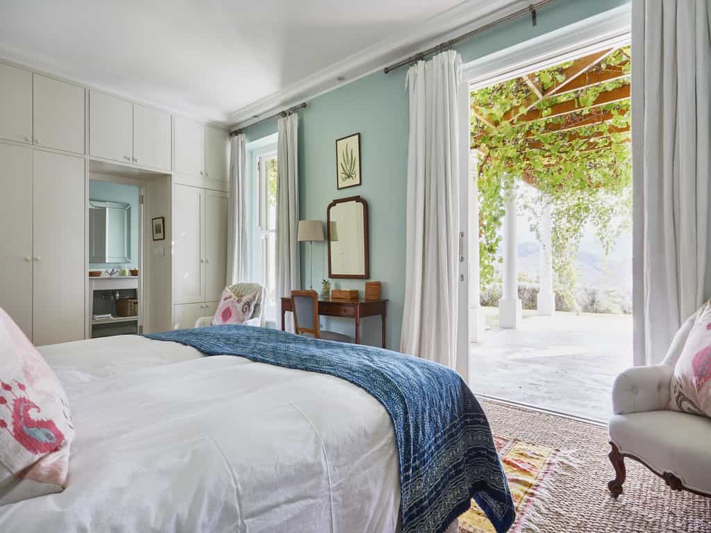 There are eight rooms, set apart by their view, which either look onto the mountains or over a sparkling pool. Set in pastoral cottages and decorated in shades from salmon to sage green, each has a high ceiling, fireplace, and an extra-length King bed. The Pool Rooms have access to the heated pool and dining under the trellis. All en-suite bathrooms are monochrome and chic with a free-standing tub, walk-in shower and underfloor heating. There is also a two-bedroom pool house, which has a private pool, kitchen, lounge and an outdoor dining area overlooking the peaks and vines.
