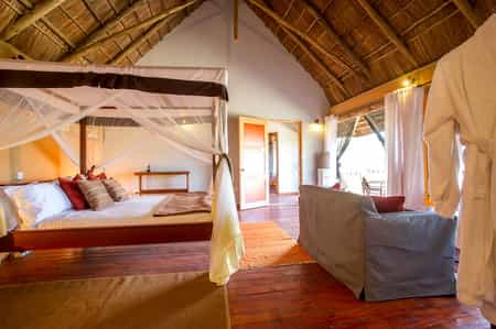 There are twenty en-suite luxury canvas tents dotted across the camp. In keeping with the communal areas of the camp, the room tents are built on raised wooden platforms with private verandas. Guests can choose between rooms with king-sized, twin or triple beds. Each tent has dark wood furniture and, in the case of the double rooms, a four-poster bed draped romantically with mosquito netting. The bathrooms boast both showers and large bathtubs - ideal for a good soak.