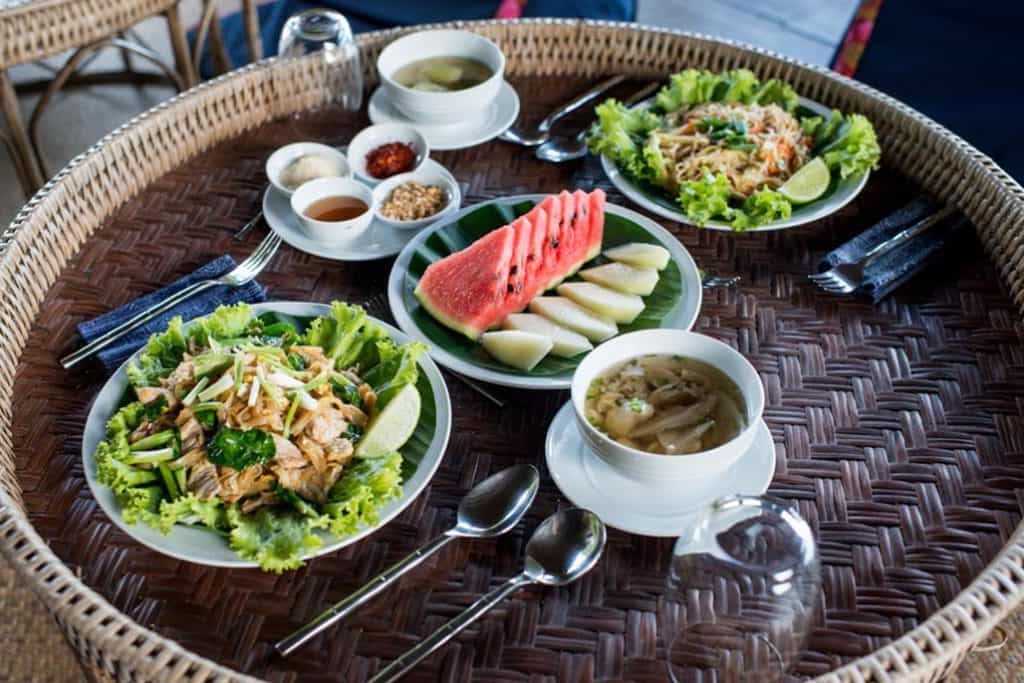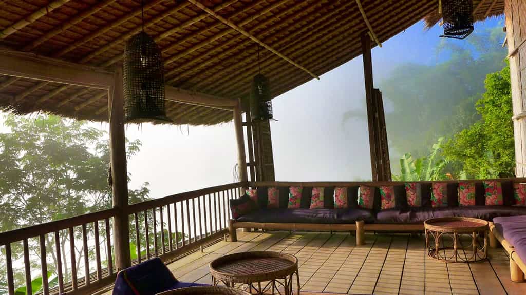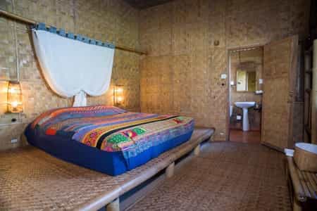 Bright, traditional outfits line the hallways, mirroring the staff who also proudly wear authentic uniforms. Life at the lodge centres around the open-sided dining area where meals are served at low bamboo tables with guests seated on cushions. Breakfast is a feast of eggs, rice soup, fresh fruit, pancakes and organic jams. Dinner is three courses beginning with glass noodle soup, followed by your choice of flash-fried vegetables, spiced curries and barbecues. Dessert is a platter of fruit harvested on local plantations.