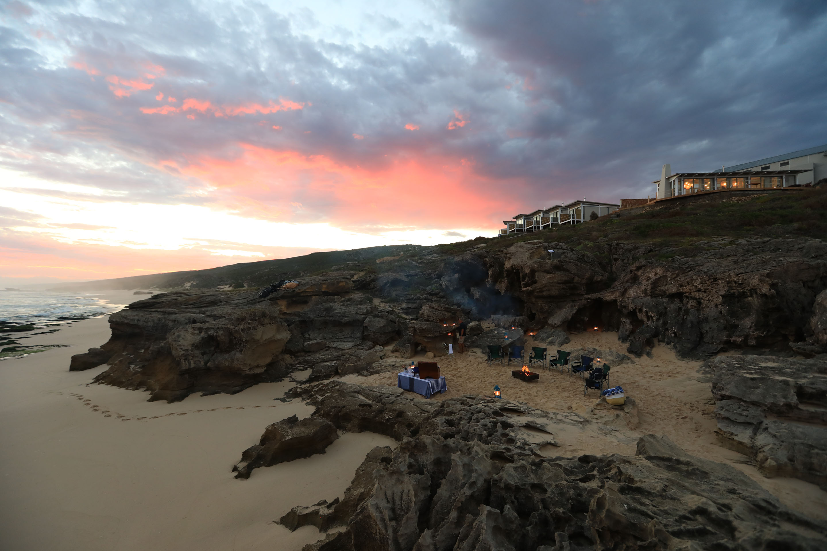 Set along a 6 kilometre stretch of cotton-candy beach, the seven rooms are cosy, comfortable and totally beach-chic. Fronted by floor-to-ceiling glass windows, the views do the talking and you'll be able to watch all the marine happenings from the comfort of your bed. Each also has a wood-burning stove to ward off the chill during winter, verandas on which to enjoy evening G&Ts and ensuite bathrooms with all the necessities.