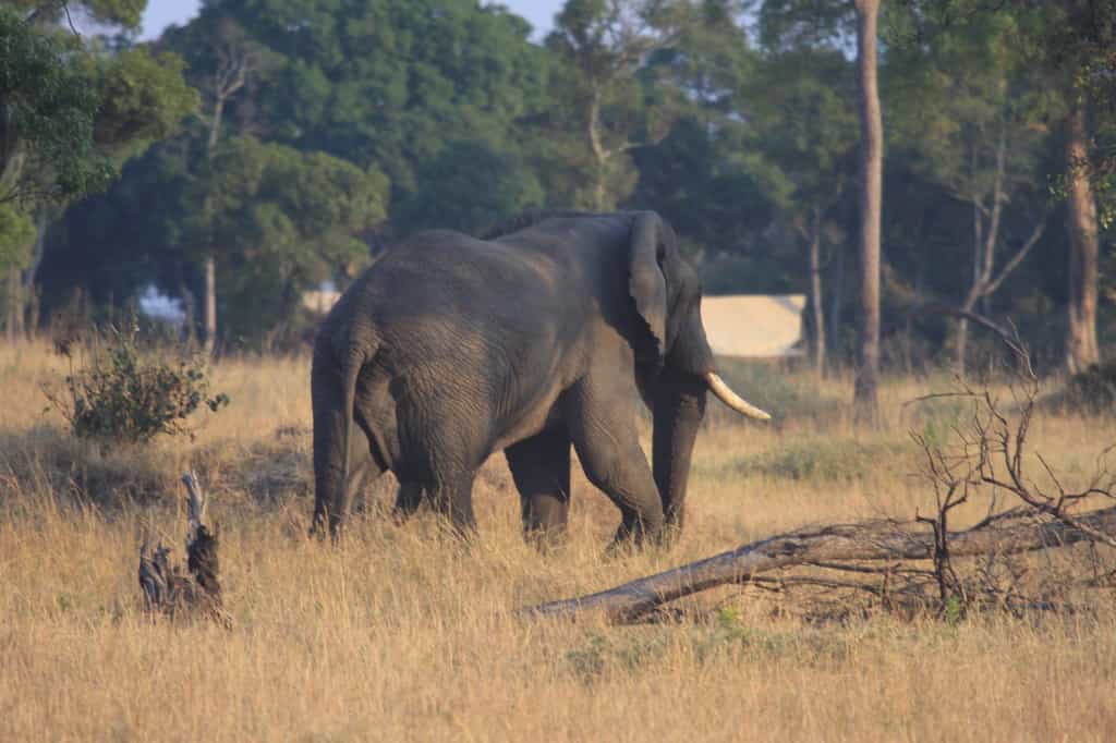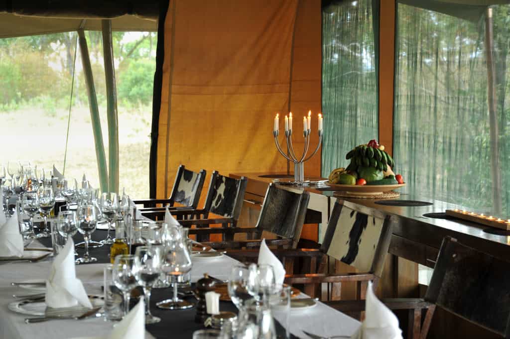 The main guest tent sits on a wide timber platform, with a comfortable lounge on one side, a dining area on the other, and a cosy bar separating the two. There’s also a small library and a curio shop, with battery charging facilities for electronic devices. The interior is elegant and stylish: leather couches, sparkling chandeliers, beautifully hand-crafted wooden furniture, and plush carpets create a pleasantly luxurious feel without losing the authentic and remote bush camp character.