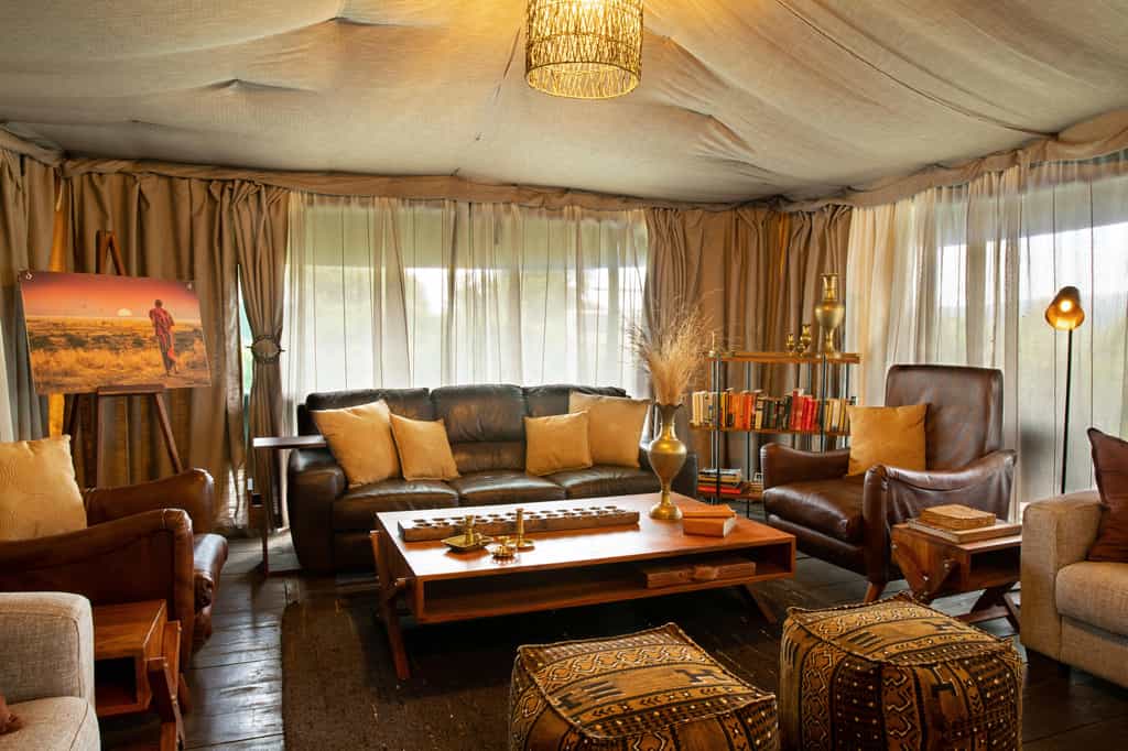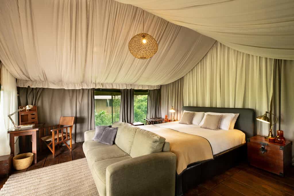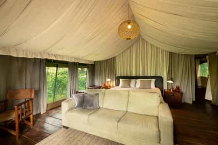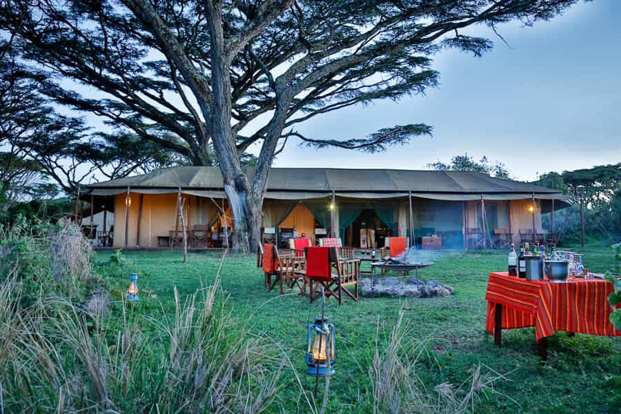 The canvas mess tent is the heart of the camp, with a large mahogany dining table on one side, where guests gather in the evenings to swap crater tales from the day, and 2 grand sofas and old chests filled with books and magazines at the other. Brightly coloured rugs adorn the floors and the bar is a charming antique cabinet with a help-yourself policy. Solar power provides consistent and sustainable electricity and you'll even find internet connectivity in the lounge and bar. Nestled in an acacia forest, the camp overlooks surrounding highlands and, when the mist lifts in the morning, it’s a breathtaking sight.