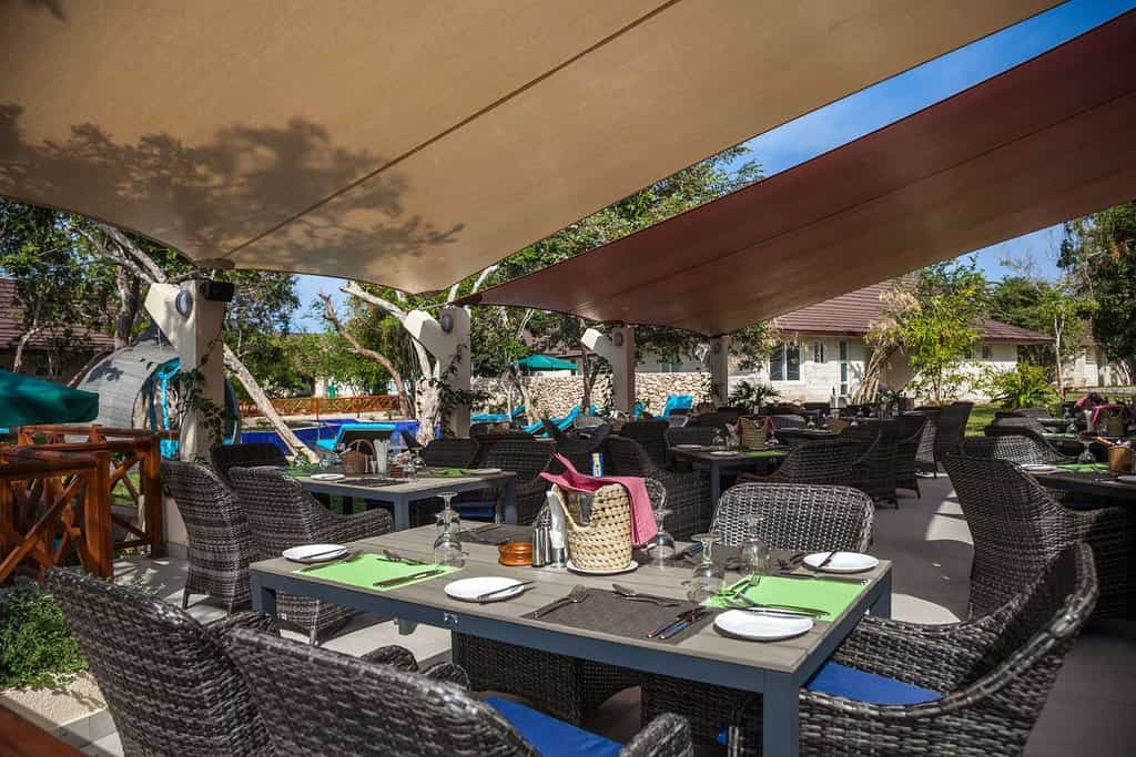 The epic center of Leopard Resort rests at the heart of the voluminous Horizon restaurant and lounge. High ceilings lined with billowing sails create shaded areas over the wicker dining chairs and wooden tables. open sided to allow as much of the ocean breeze to drift through. Terraced down from a large deck is the swimming pool surrounded by sun loungers and the ocean beyond. Spanning out from Horizon are several other bars and five other dining areas.