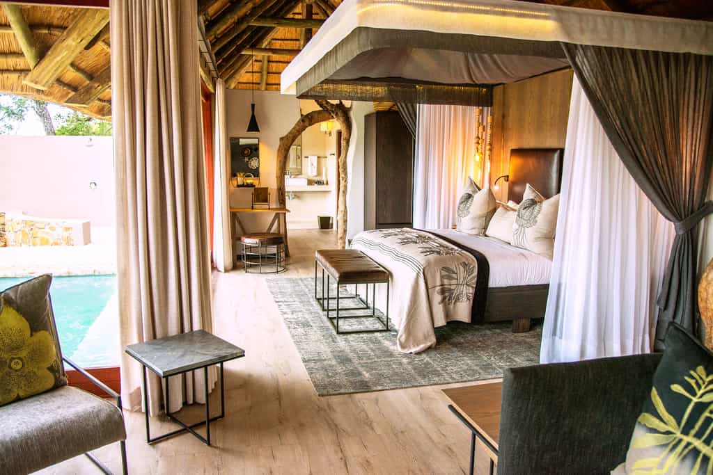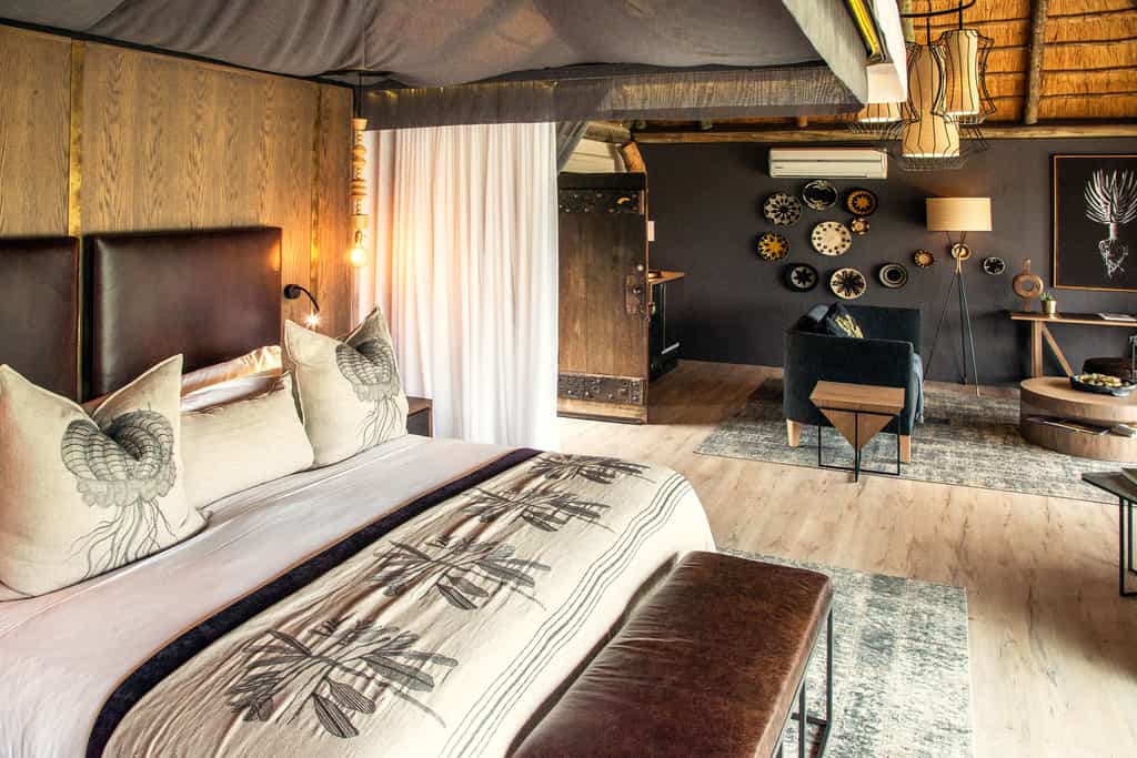Strung along the Mabrak River, Leopard Hills has just eight stone-and-thatch stilted suites with glass frontages that allow you to gaze at the bush. Each is beautifully furnished in relaxing colours and has a king-sized bed, air conditioning, inside and outside showers, a comfortable lounge, reading material, a wooden veranda and personal pool. Anything you could ever need has been taken into account, including underfloor heating for chilly winter visits. A safari experience at its best!