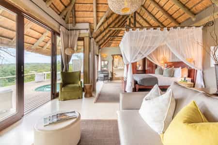 The ochre-walled main area is a good place to gather after a visually rewarding game drive. Kick back in the lounge, send 'you should be here' messages to your friends and family, chat to the other guests over dinner (it's fine cuisine and there's lots of it), enjoy a drink at the bar or on the veranda and dip in the pool. In the library are plentiful reference and other books, and African journals, to browse through.