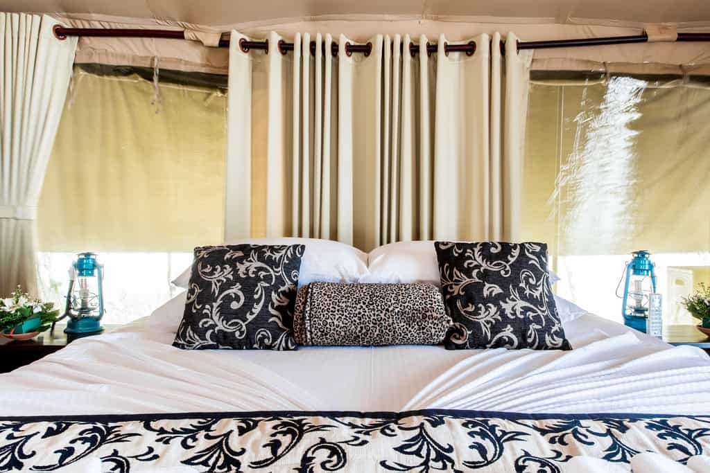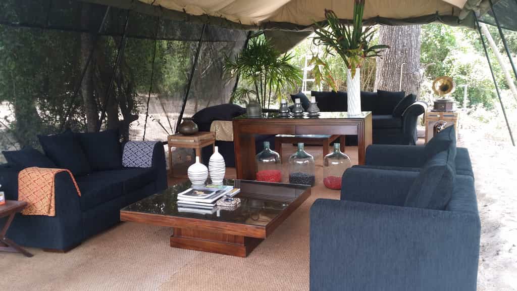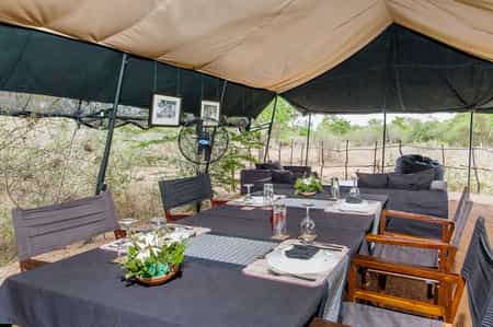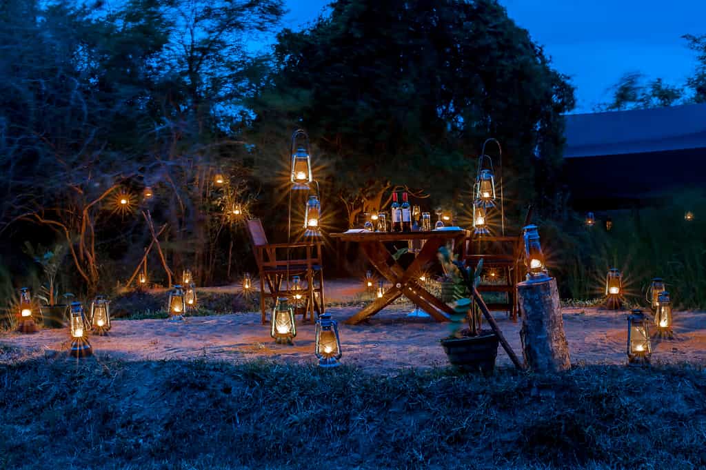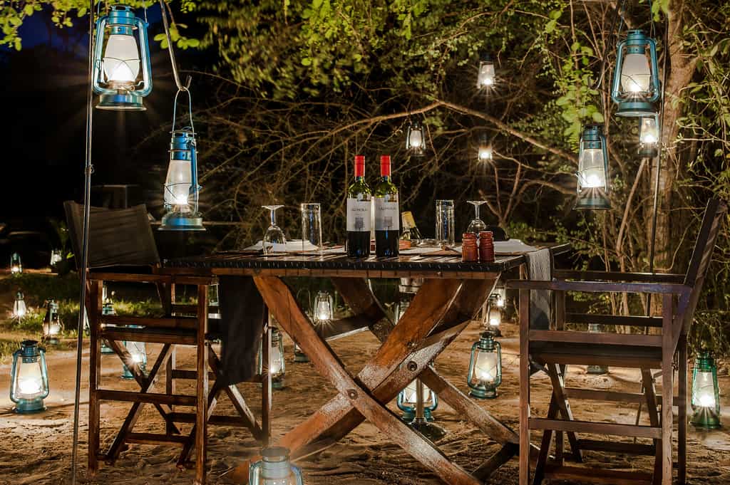 Set up in a clearing next to a bubbling tributary, the open-sided dining tent is simple but scenic. You can also choose to have your meals al fresco in the light of a 'bush chandelier' of old-school kerosine lamps or enjoy a barbecue dinner. Leopard Trails also has a good-sized lounge tent with deep-set blue sofas, fun decor and a small library. There's a small bar where you can grab a drink to enjoy around the firepit and watch the stars.
