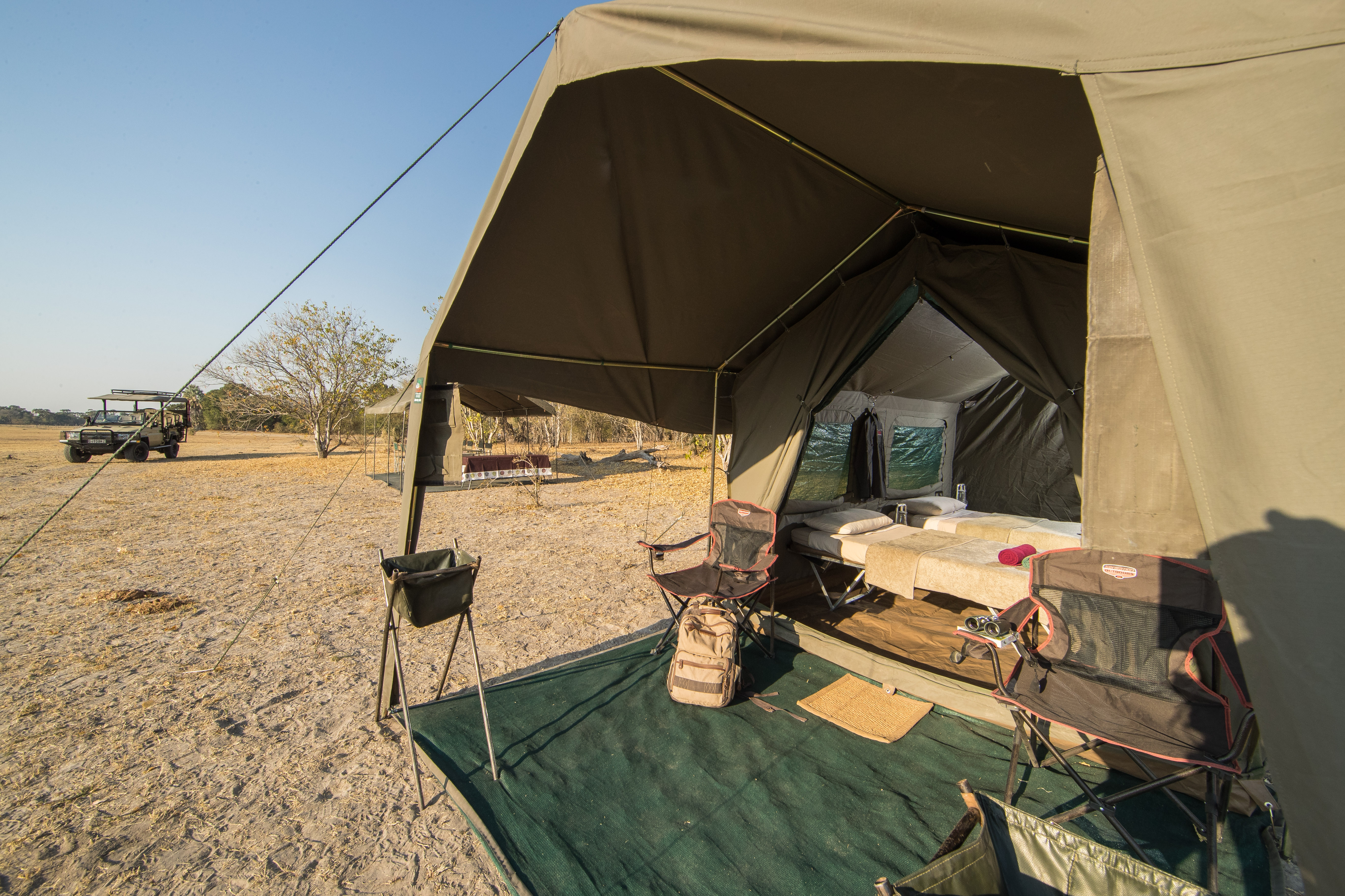 Each of the three camps offers a different degree of luxury, though all are comfortable, clean and well-appointed. The most luxurious is the first, Kalahari Plains, with glass doors, a large deck, a star bed and en-suite facilities. Tau Pan is spacious with sliding mesh doors, huge verandas and en-suite facilities. A classic Meru-style tent, Letaka provides the most basic accommodation, with a few (very comfortable beds) and en-suite bathrooms with flush toilets and bucket showers.