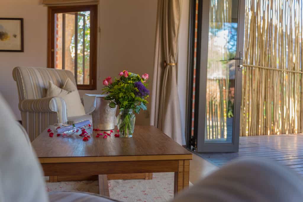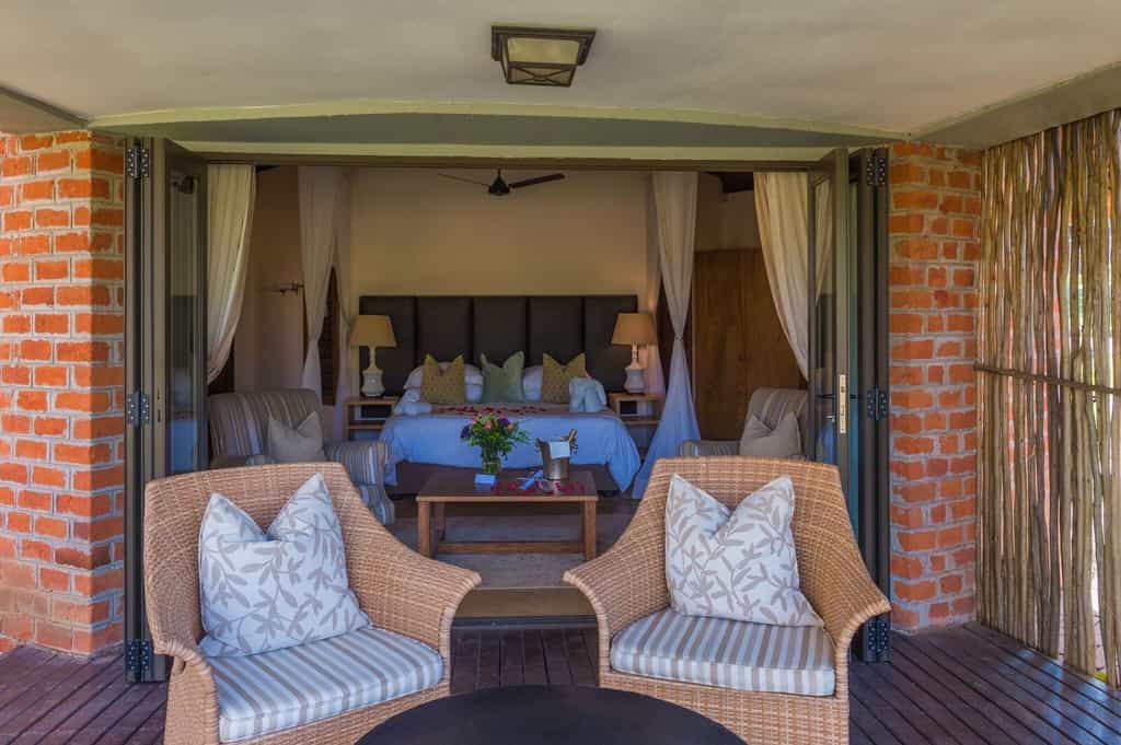 Simply designed to mesh with the environment, 10 Deluxe and 2 Family chalets are spread across the farm grounds, with immersive bush views. Open-plan inside and circular in shape thanks to their rondavel brick walls, the smell of the thatched roofing adds to the farm ambience. With tasteful and contemporary furnishings in neutral shades, a lounge opens up through folding bay windows to a private wooden deck and verandah, shielded from neighbours by bamboo slats. All rooms are en-suite (and boast a spacious bath and shower) with satellite TV and Wi-Fi, plus a trusty bar fridge.