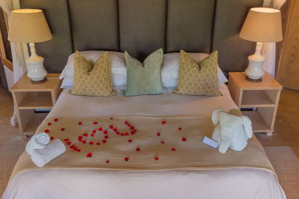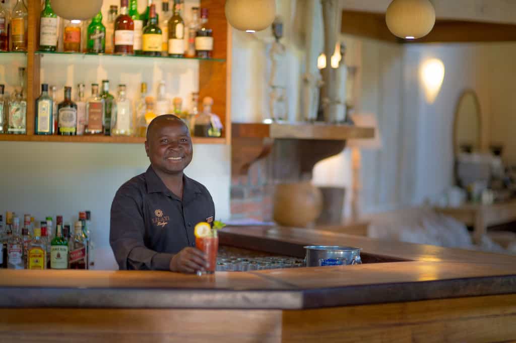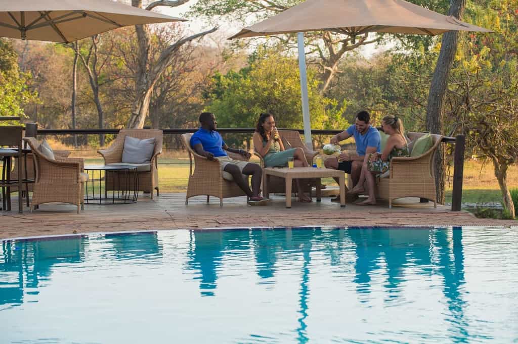 A voluminous, thatched-roof ceiling and central reed chandelier are the focal points of the spacious dining room. The bar and lounge are sophisticated yet homely, with a touch of Zambian creativity and a series of sumptuous couches to recline in, opening up to an outside dining area where you can spot approaching animal visitors. Amid the lush gardens is a large pool surrounded by wicker loungers and sunbeds where you can catch a good glimpse of antelope coming right up for a graze.
