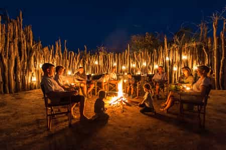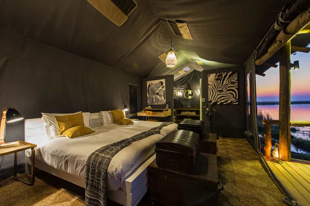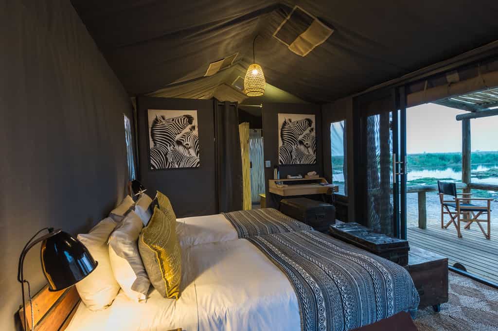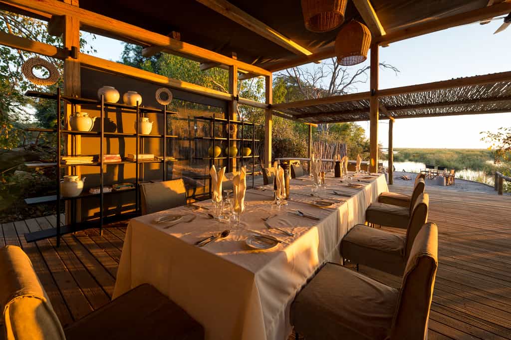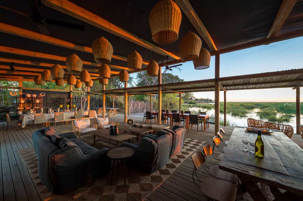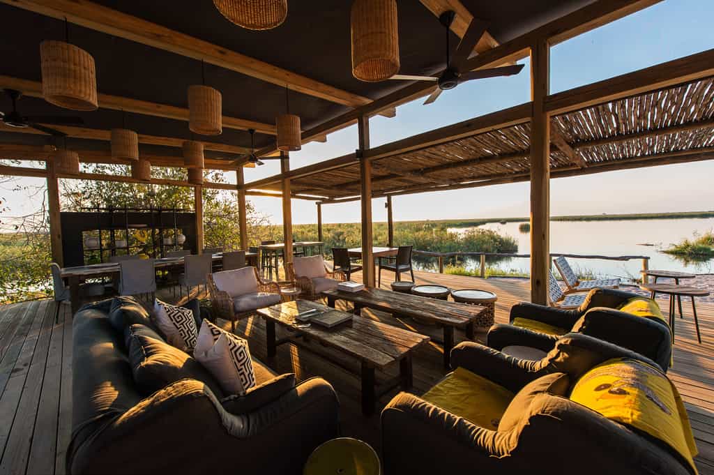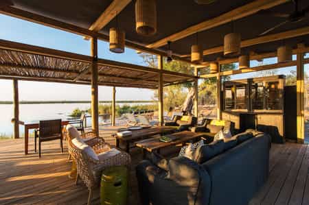 From the slightly raised perch of the main area, you'll have excellent views over the swamplands and floodplain beyond. The open-sided structure houses a long bar counter and the dining and lounge areas with plenty of shade and seating. Stylish furnishings that are both modern and quintessentially African, give it a clean, understated feel that isn't distracting and is just the right amount of luxury in the bush. A sandy campfire area on a small bank above the hippo-filled floodplain, is the hub for evening beverages under the stars.