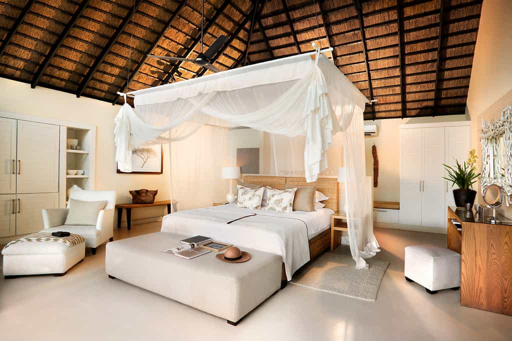 The open-plan communal area is thatched and beautifully furnished with rattan couches and soft furnishings in natural shades with touches of bright colour. Relax in the comfortable lounge or on the huge wooden deck, where water features make it feel like you're on the river, and soak up the sounds of the bush. On chilly evenings a fire is lit, so you're always comfortable. Meals are served indoors and out, and there are two pools if you're finding the bushveld heat overwhelming. Wi-fi is available in the lobby, bar and restaurant.