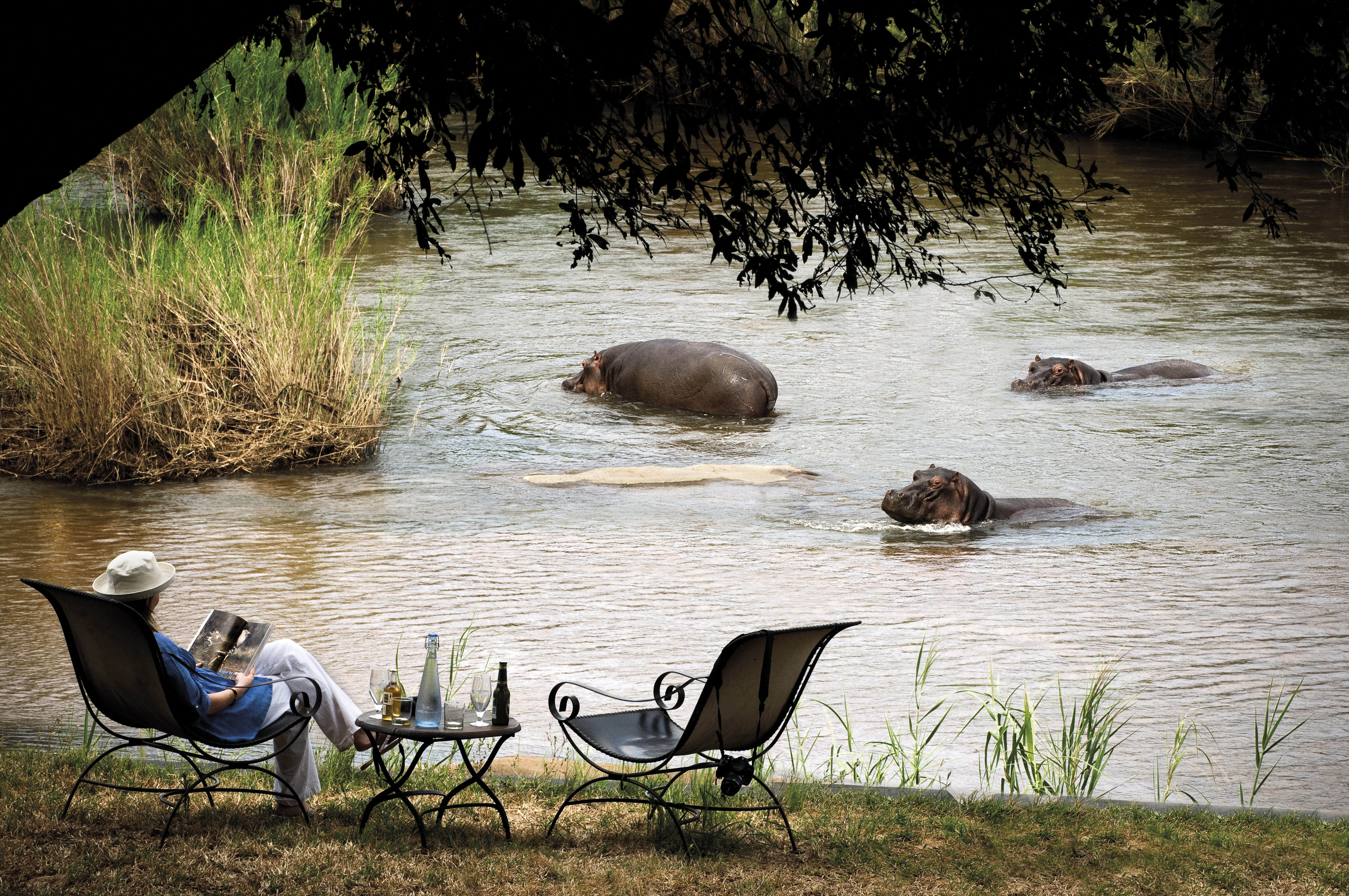 Expansive, double volume, thatch roofs are nestled under the leafy canopies of ancient trees; their trunks burst through the large wooden, terraced platforms that overlook the river. Large leather couches, classic cotton fabrics, and modern wildlife-inspired artworks are scattered across the vast living areas, subtly complimenting the natural surrounds. Inside, there is a library with a voluminous fireplace for chilly winter nights, and outside, a cooling infinity pool, just a stone's throw from the banks of the Sabie River.