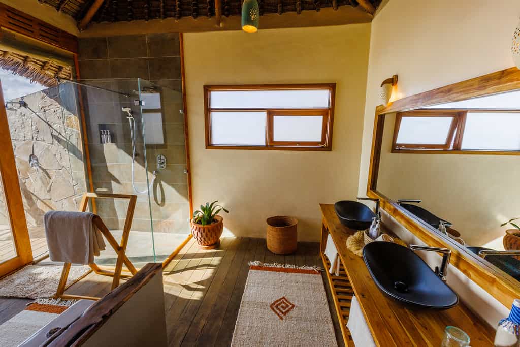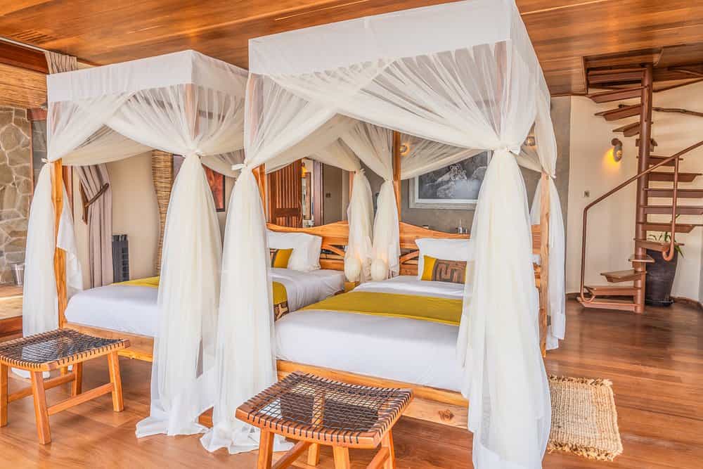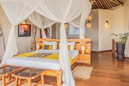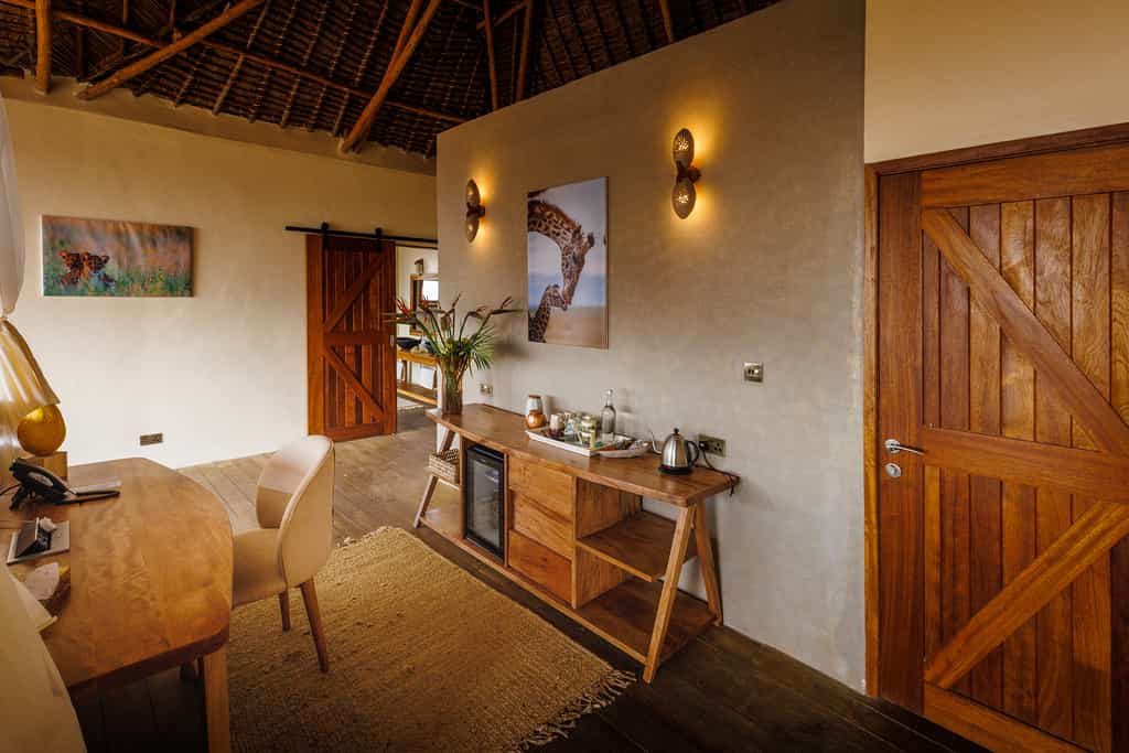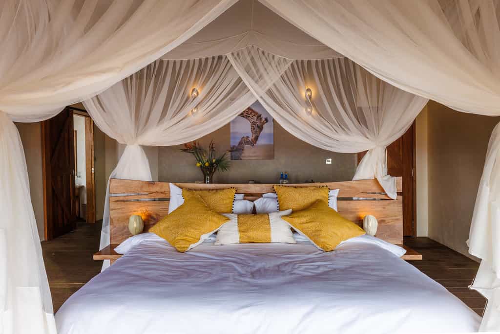 Lions Bluff offers 12 rooms dotted along the ridge, each with a high thatched-roof, canvas walls, an ensuite bathroom, large verandah and the most magnificent, sweeping westerly views. Five of the rooms have double bed configurations, while six have twin beds. There is one double-story family unit that sleeps four comfortably. Additionally, there is a traditional stone-walled cottage with two bedrooms and a thatched roof, and another timber, canvas and stone cottage. Bathrooms have simple showers and flush toilets which could do with a slight upgrade.
