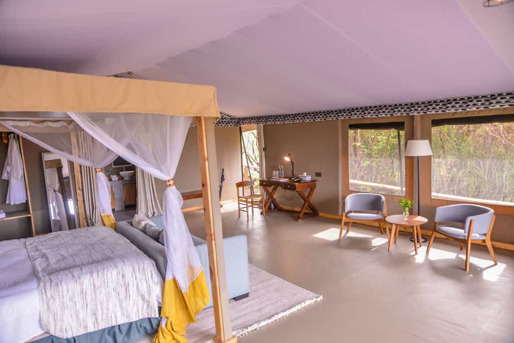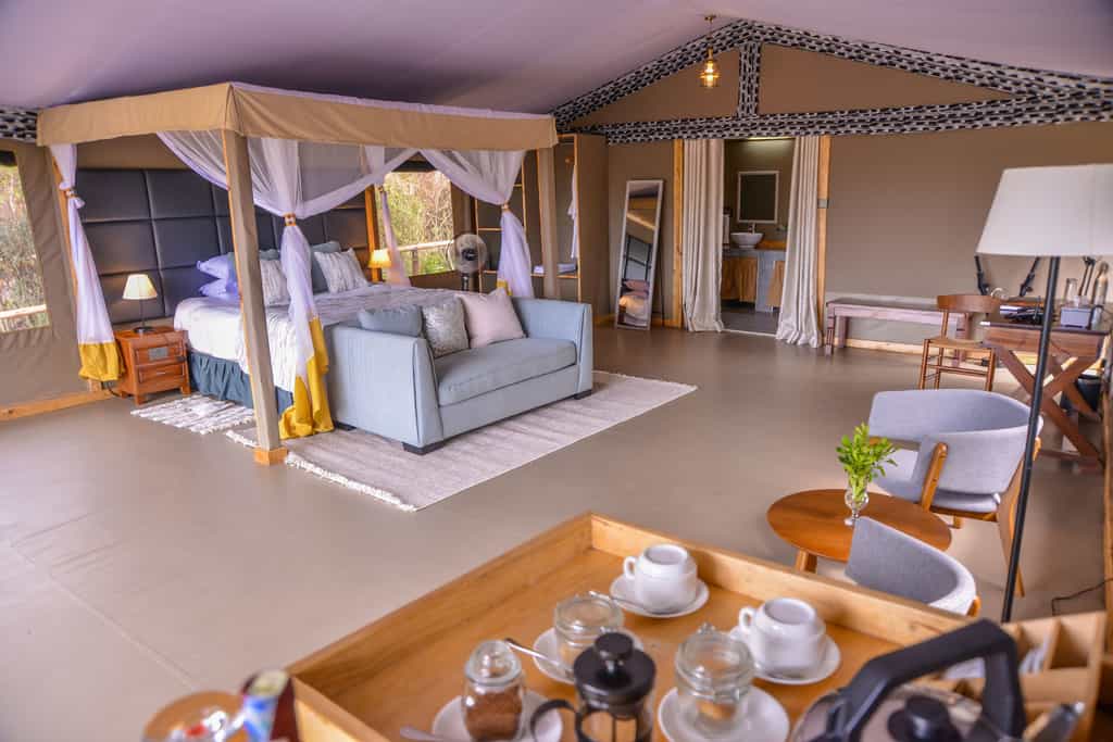 The guests main areas features very spacious comfy lounges connected to a fully stocked bar , spacious balconies that gives them endless views of the Maasai Mara, Indoor and outdoor dining areas,a campfire to be enjoyed in the evenings, two gazebos with amazing views of the Mara. Outdoor dining areas and umbrella shaded areas to enjoy your drink while watching wildlife roams on the other side of the river.