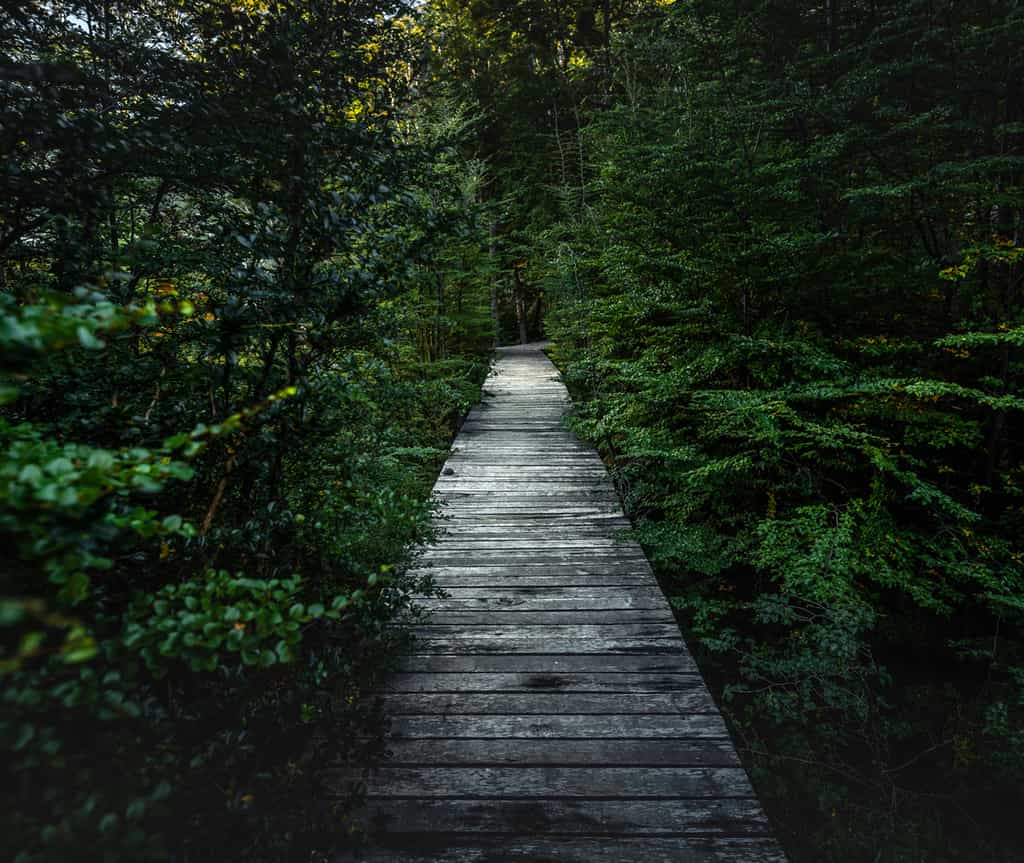 Venture through the forest on wooden pathways to find your perfectly positioned cabin on the lake.