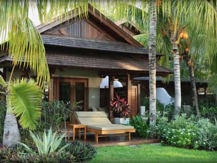 A-framed island styled rooms and suites are dotted throughout the tropical gardens. Some, like the junior suite, come with marbled whirlpool bathrooms and either a balcony or outside terrace, perfect for in room dining. Splurge for the Honeymoon suite for the prefect romantic escape. Each room is decorated in light cotton with all the modern amenities like air conditioning, minibars and DVD players. Elegant, dark wooden shutters open up to the lagoon waters and manicured green lawns.