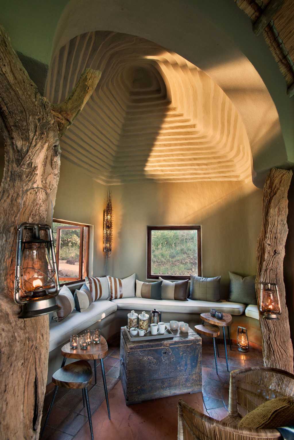 The main area, with its open-sided lounge and glassed-in dining room, enjoys supreme vistas of the reserve. The thatched roof and sand-coloured walls give it a down-to-earth feel, and the furnishings strike just the right balance between smart and comfortable. Incorporating natural textures and materials such as wood, stone and brushed concrete, the decor blends harmoniously with its surroundings. Plush furnishings, a well-stocked bar, generous deck and cosy fireplace all ensure you'll want for nothing in this wilderness.