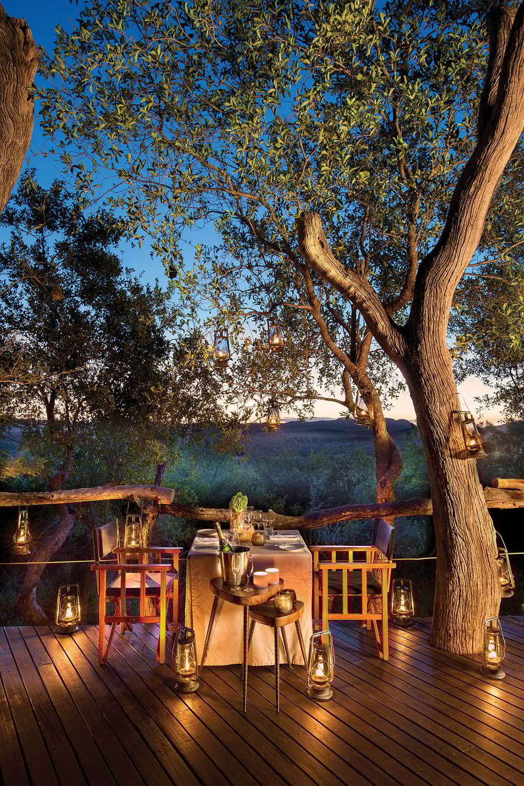The four enchanting chalets are constructed with rounded edges and a floor plan that's best described as "fluid". Double doors and large curved windows mean nature never feels cordoned off. To one side, a luxurious chaise longue beside a small fireplace is ideal for a midday nap. Outside, an elevated deck with a small plunge pool overlooks the bush and its inhabitants. The bathrooms are large, each fitted with a lovely deep bathtub, spacious walk-in shower and a double basin.