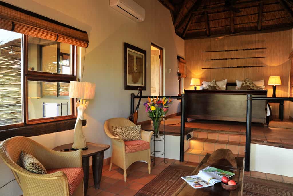 Accommodation is provided in 16 split-level chalets set deep in the riverine forest for total privacy. Stone floors and thatched roofs keep things cool and airy, and walls are adorned with attractive artefacts to to create a rich African ambience. Each has an en-suite bathroom with rain shower, and wooden decks overlooking the river and forest offer a perfect siesta retreat. Mod-cons include air-conditioning, mini bars and tea and coffee facilities. Upgrade to a luxury suite for a separate lounge area and outside shower.