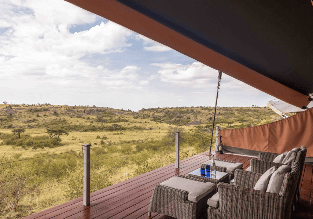 The camp sits on a ridge overlooking a wide wooded valley and a small river. The structures are an unusual fusion of steel frames supporting PVC roofs, traditional Meru-style canvas, smart leather furniture and bright textiles. The main lounge and bar area are separated from the dining room by a large wooden deck, complete with fireplace and crescent-shaped couch. A flight of steps leads down to a lovely rim-flow pool, and yet further to the spa, on the valley's floor.