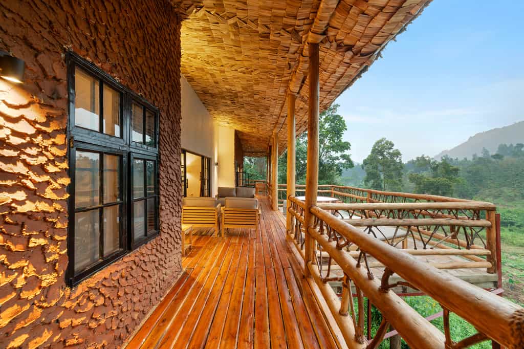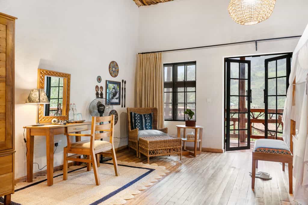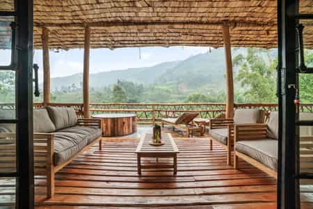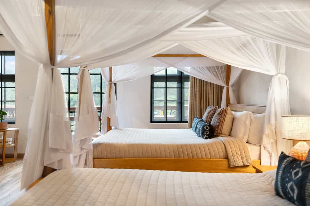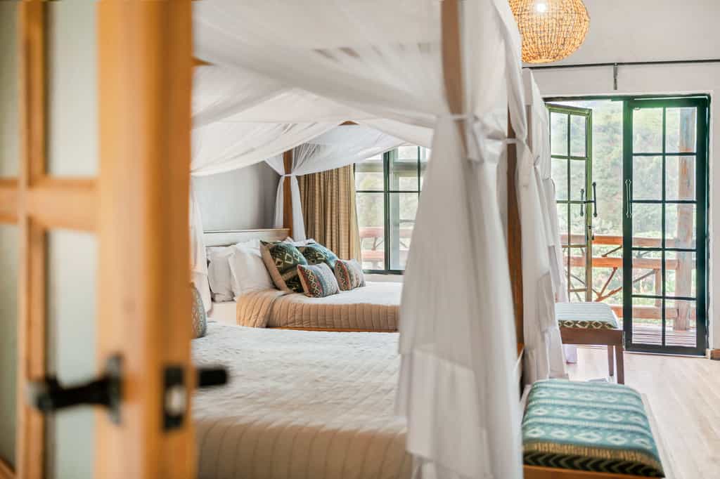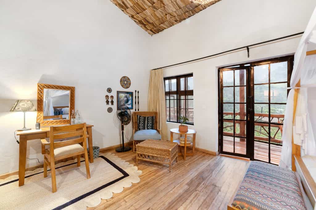 Each of the eight spacious stone cottages has wide double doors, large windows that allow you feel at one with the forest, and a balcony overlooking the valley. Suites have hardwood floors, simple beds with good linens and mosquito nets, a writing desk and an en-suite bathroom with mosaic-tiled showers. The cottages are simple but super clean and very comfortable. In August 2024, they will be opening two new family villas.