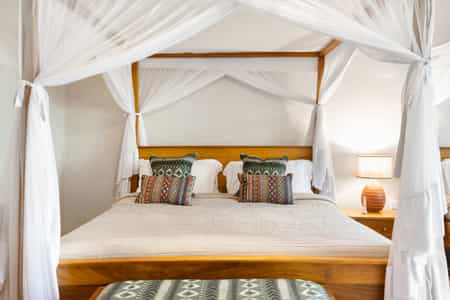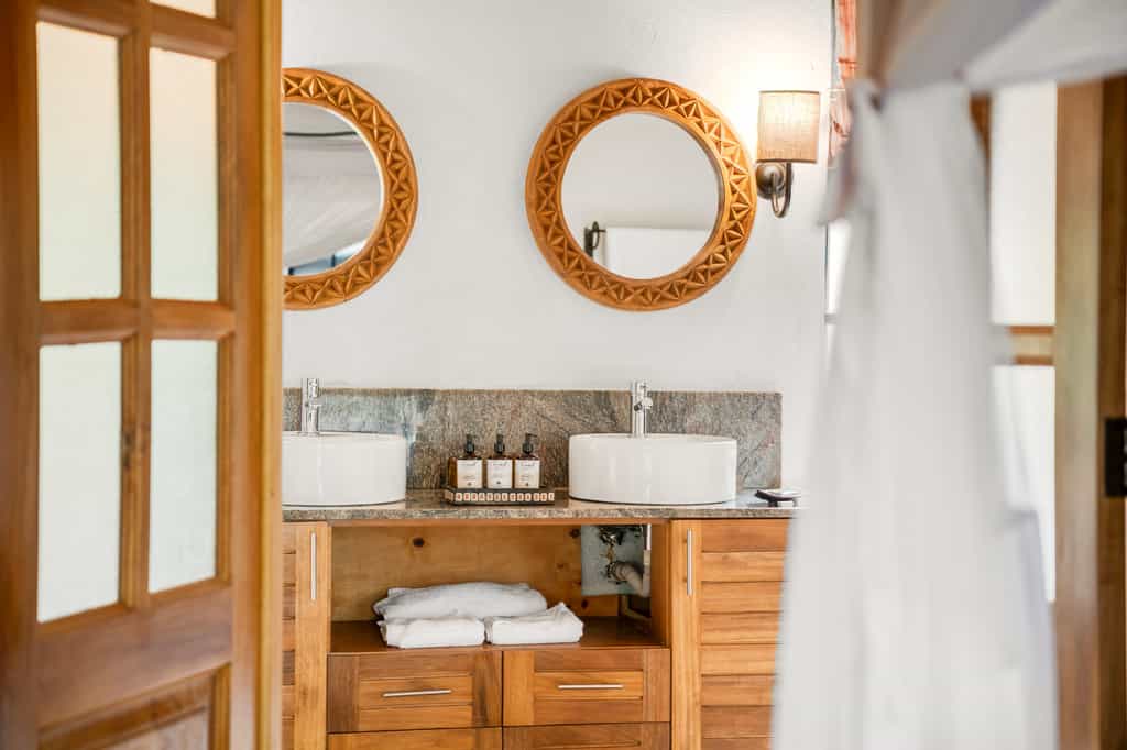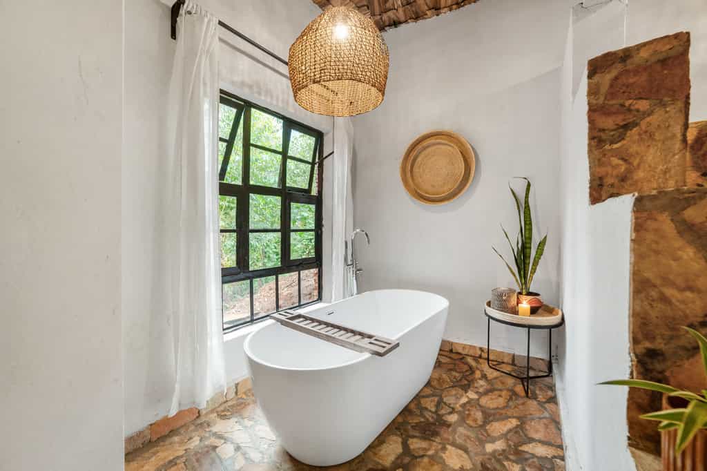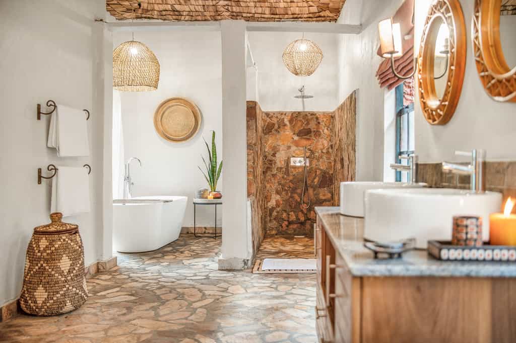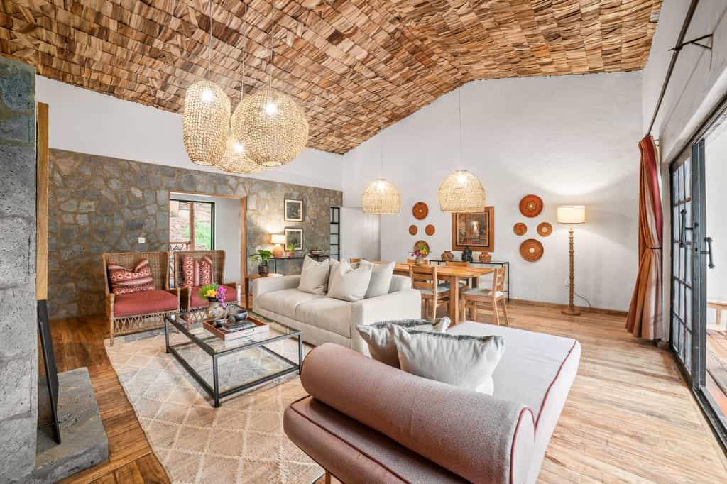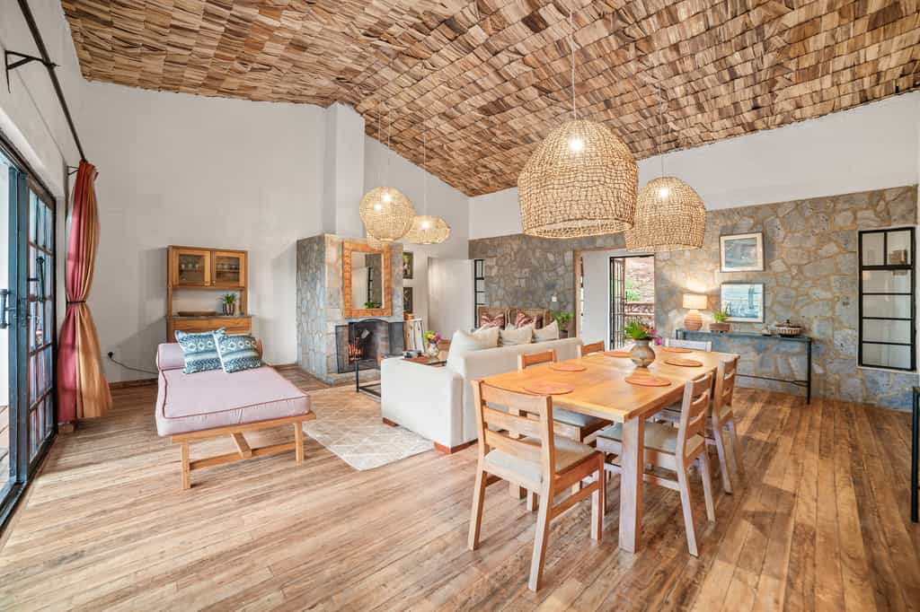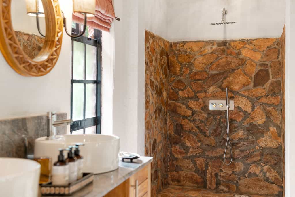 Each of the eight spacious stone cottages has wide double doors, large windows that allow you feel at one with the forest, and a balcony overlooking the valley. Suites have hardwood floors, simple beds with good linens and mosquito nets, a writing desk and an en-suite bathroom with mosaic-tiled showers. The cottages are simple but super clean and very comfortable. In August 2024, they will be opening two new family villas.