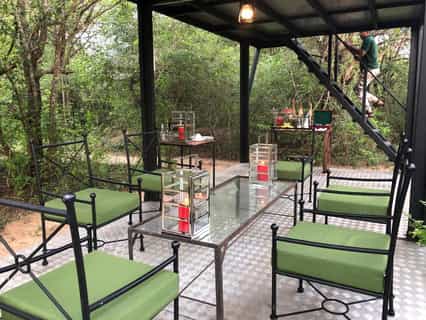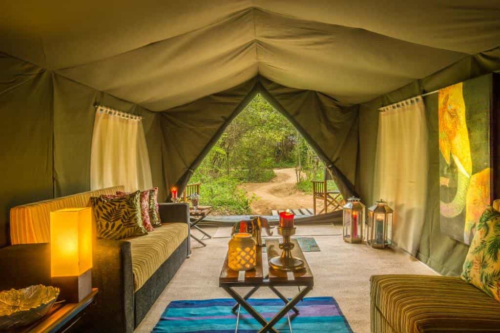 Mahoora pioneered the tented safari camp concept in Sri Lanka, and their Yala setup remains one of the best ways to maximise your chances of spotting a leopard in what's officially the densest leopard population on the planet. The camp sits on a 10 acre private reserve bordering the national park itself, which means you're using the quieter Katagamuwa gate rather than fighting the crowds at the main entrance. The tents are proper glamping territory with en suite bathrooms, hot showers, flush toilets and full beds, so you get the thrill of sleeping in the bush without actually roughing it.