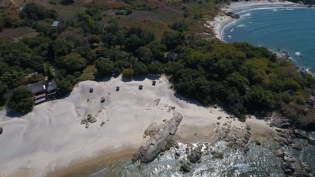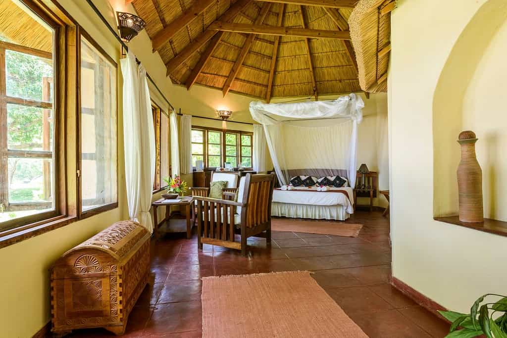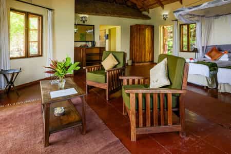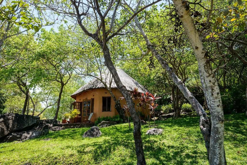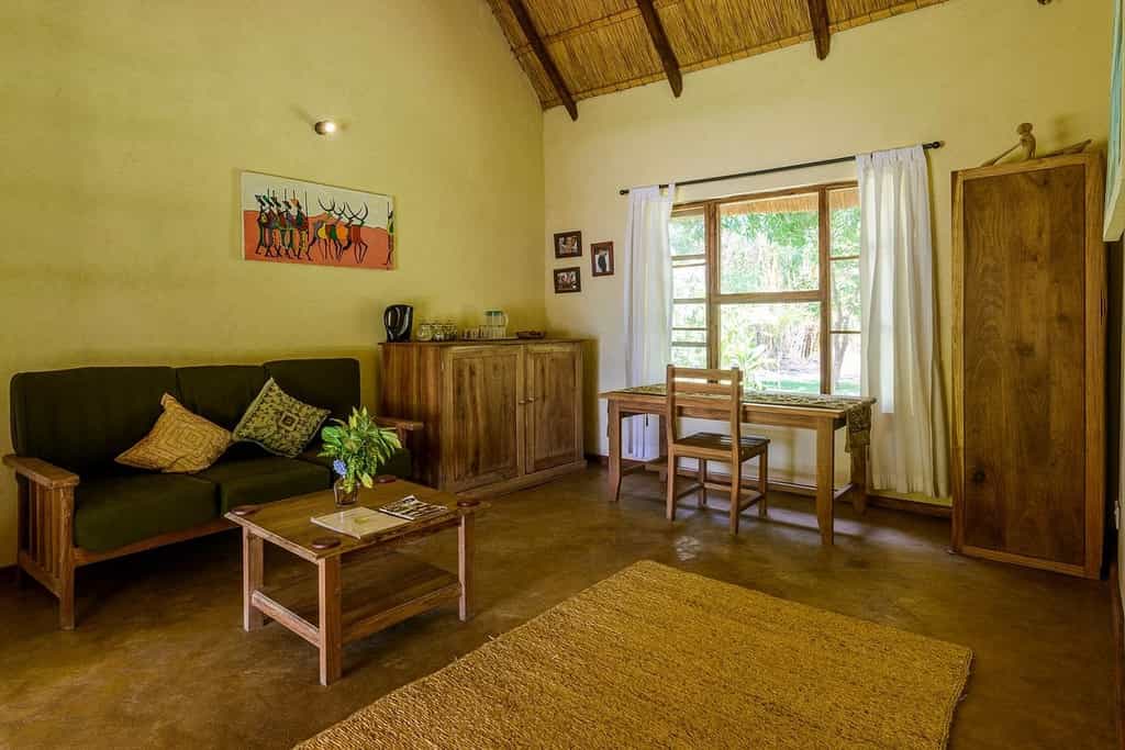 The double-storey main area blends nicely into its treed surrounds, with stone foundations and pillars, and a traditional thatched roof. The structures are simple but well-constructed for the hot tropics, with large windows and wide-swinging doors that lead to expansive patios. All of this makes the most of the broad, sandy cove and lake views. Inside, the lounge is open and airy, furnished with local wooden chairs and sofas.