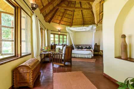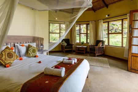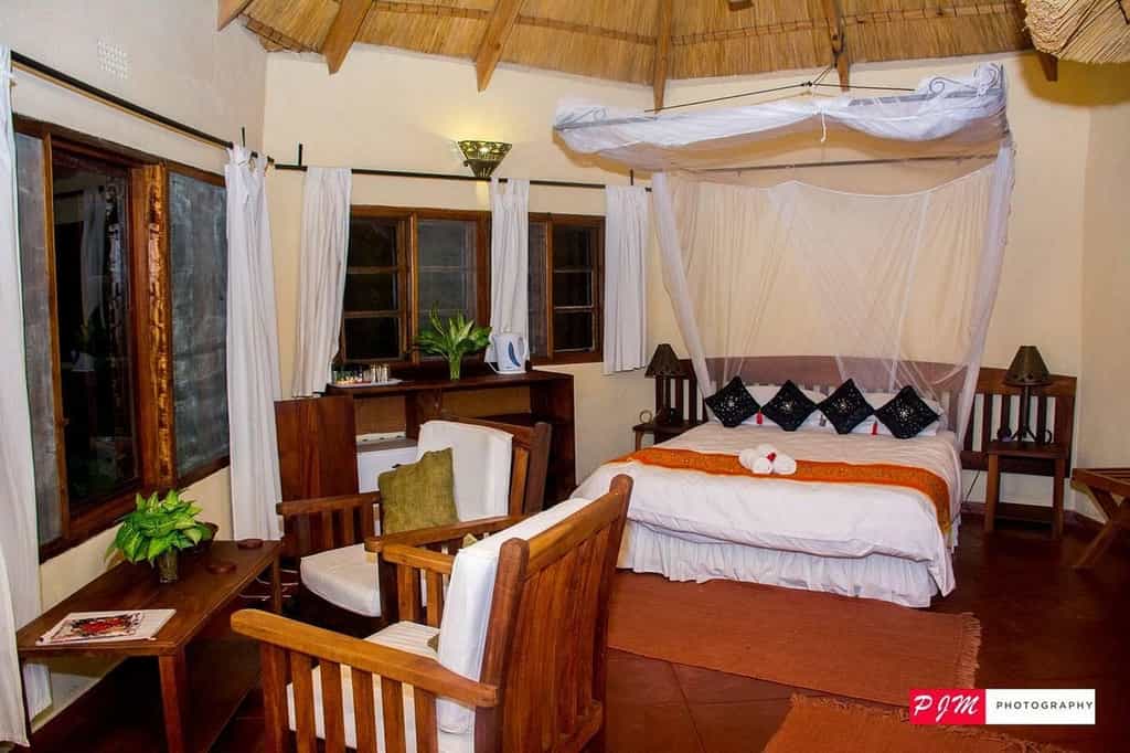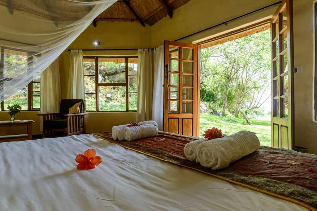 There are 11 self-catering chalets dotted around the property, each with outdoor patios leading onto the surrounding gardens, a short stroll from the crystal-clear lake waters. There are three Superior Chalets - two built directly into the rock - all with full en-suite bathrooms (bathtub and shower), a large open-plan living area, a tea and coffee station and a mini fridge. The five Standard Chalets are smaller, with half bathrooms (no tub). There is a Superior Family Chalet with two separate bedrooms that sleeps a total of six, adjoined by a small lounge area. The Standard Family Chalet has a single room with a double bed and two twins. Both Family Chalets are equipped with en-suite bathrooms and tea and coffee stations.