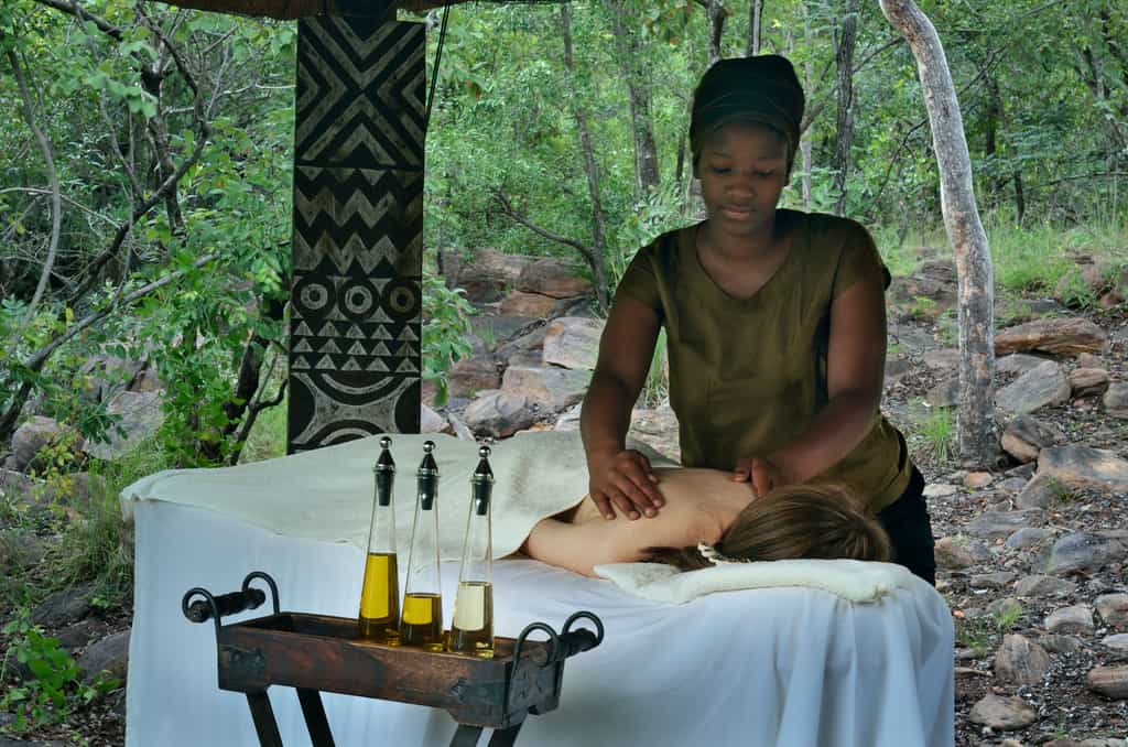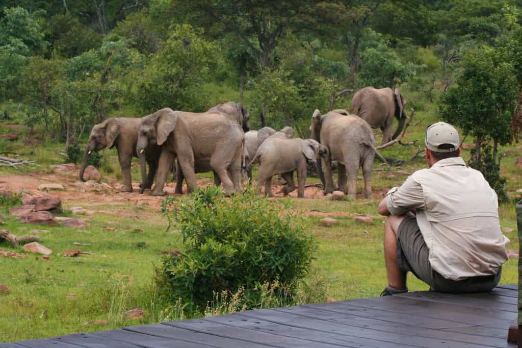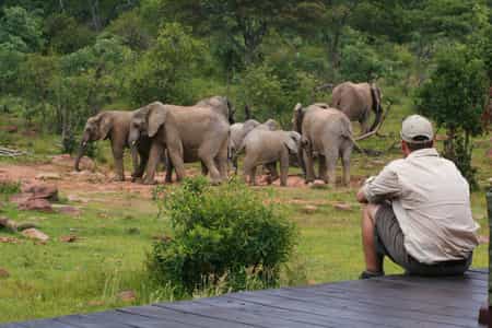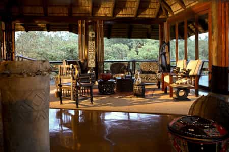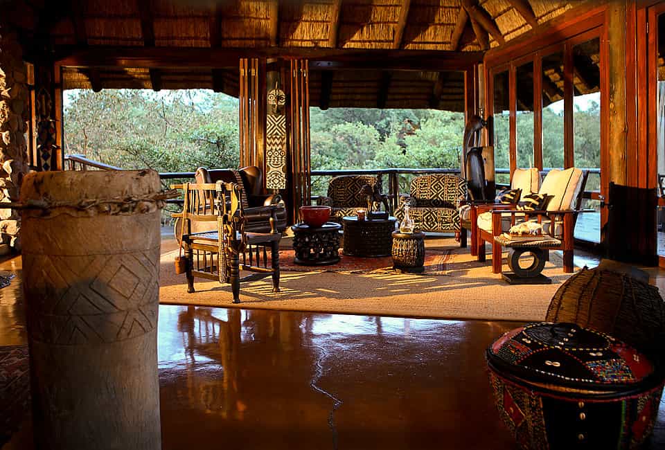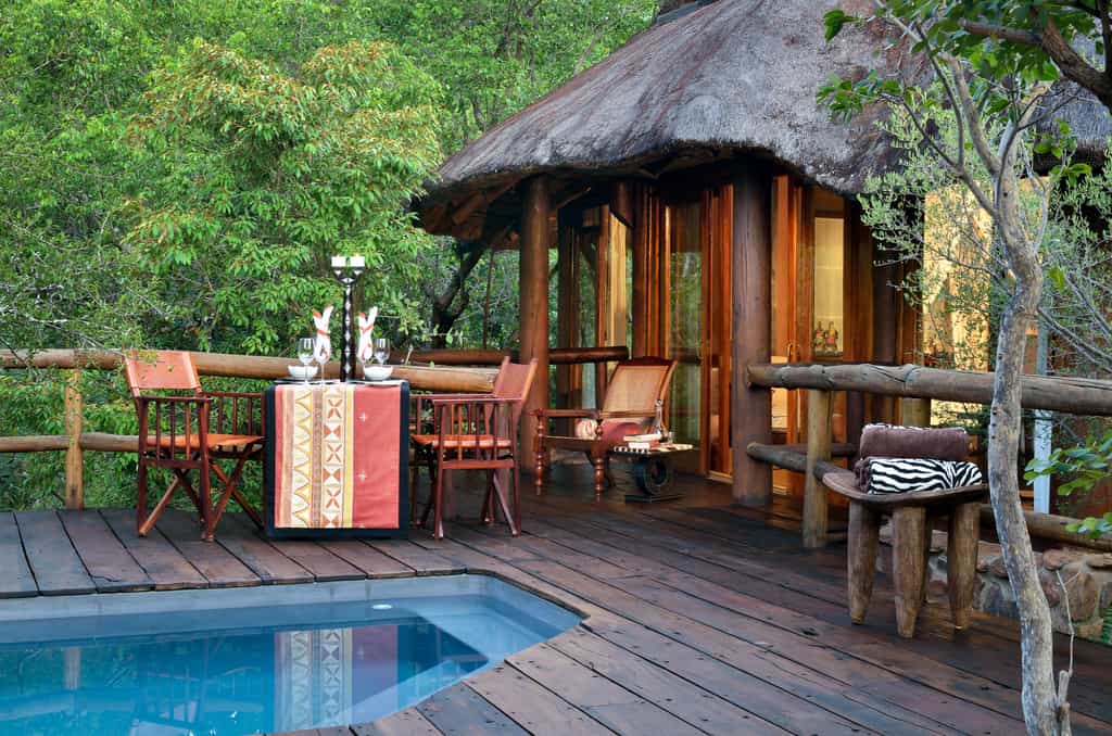 The main area is an elegant thatch and stone sanctuary facing out across wide teak decks suspended over the sloping mountainside, with rough-hewn steps leading down to the rock pool below. African relics and wildlife-themed works of art echo the textures and colours of the surrounding bush throughout the quiet lounge areas and reading nooks, with a contemporary corner bar overlooking Makweti Gorge. Set back from the lodge, a tranquil viewing lounge overlooks the waterhole where wildlife comes to drink.
