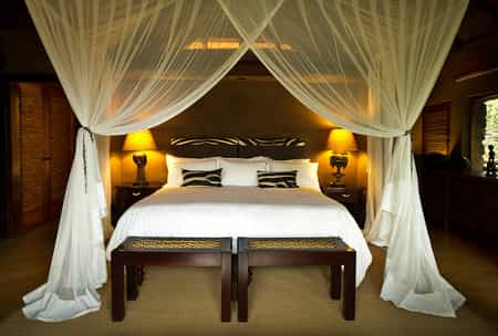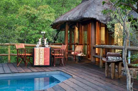 Each of the five thatch and stone suites are well spaced in secluded privacy along a ridge of rocky hillside, with views across the valley below. Interiors are luxuriously furnished with cool colonial-style linens, richly coloured African fabrics and romantic fireplaces for the chilly Waterberg winters. The en-suite bathrooms feature deep Victorian baths, and indoor and outdoor showers. Three suites have private plunge pools, and each has its own private viewing deck.
