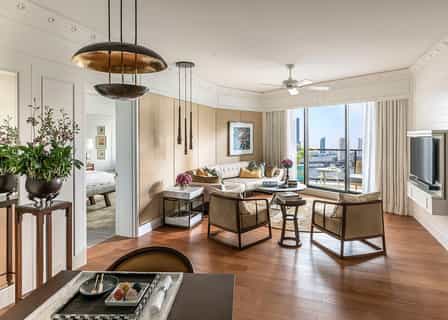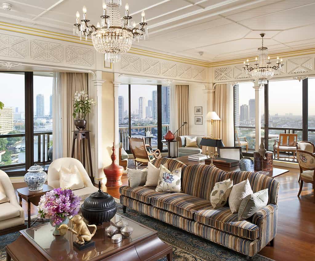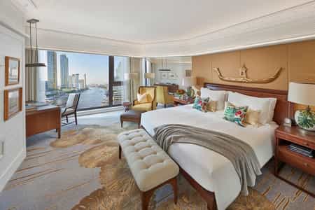 The rooms and suites are a polished blend of lavish lotus-print rugs, gold-framed images of Bangkok and king-size beds. Features vary between rooms but most have a cushy living area and some enjoy a private balcony. The bathrooms are clad in Italian marble with a deep tub or shower. As you rise in floor level, the suites get ever grander including 12-seater dining tables, walk-in closets and a private spa. The Oriental Suite is rather spectacular with a wrap-around terrace, entertainment room and kitchen.