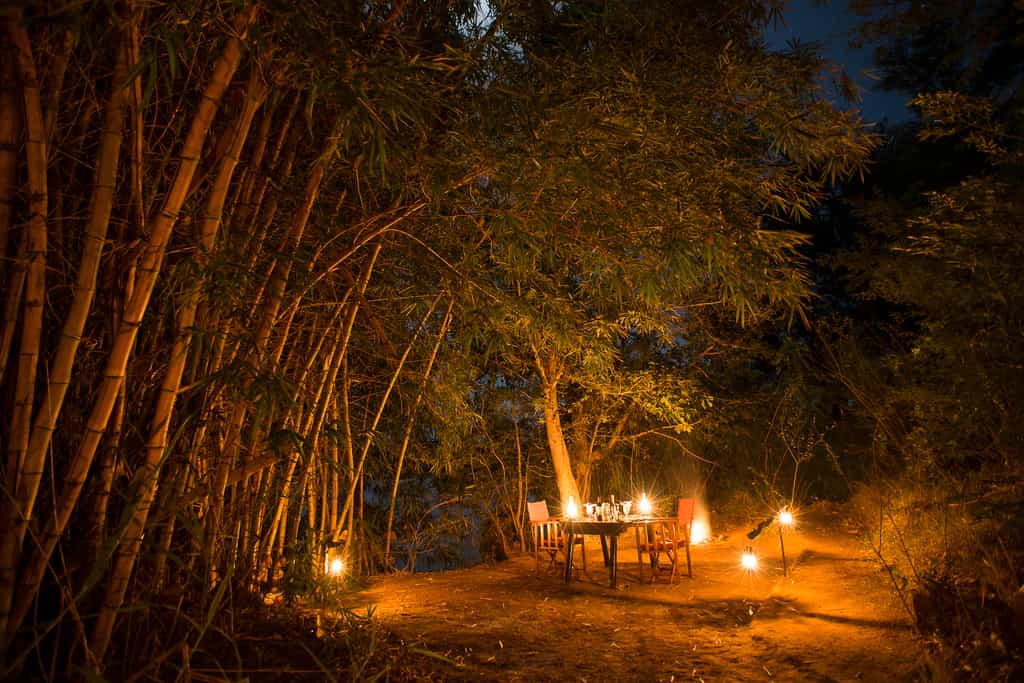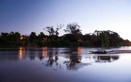 The main guest area is an open-plan canvas and thatch tent overlooking a wide sandy beach on the river. Beautifully carved Malagasy tables and chunky wooden couches are scattered throughout the lounge and bar area, with a separate sheltered dining room on a raised terrace. Meals are sometimes served under the stars on the beach for something different, and the food is excellent. On the lower deck is a small swimming pool and shady outdoor lounge terrace.