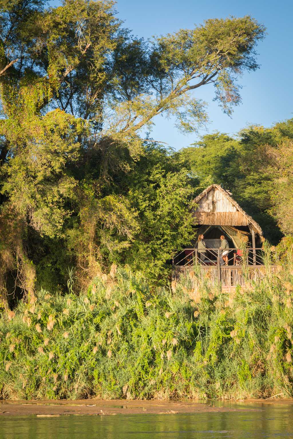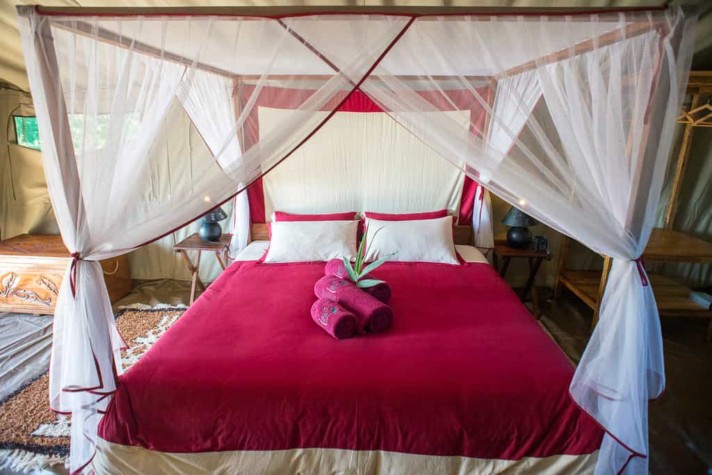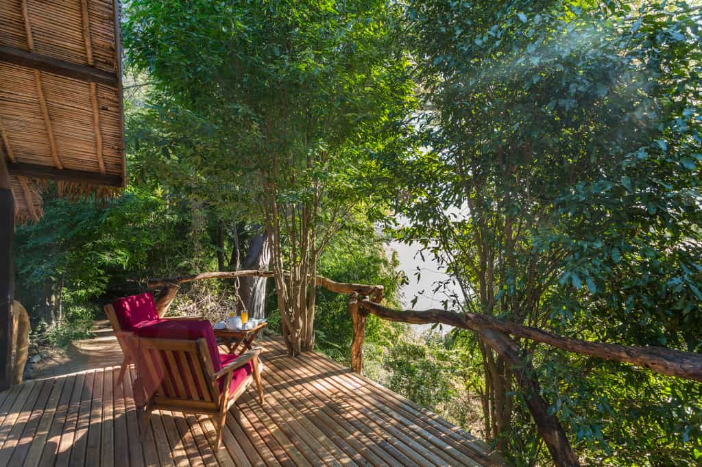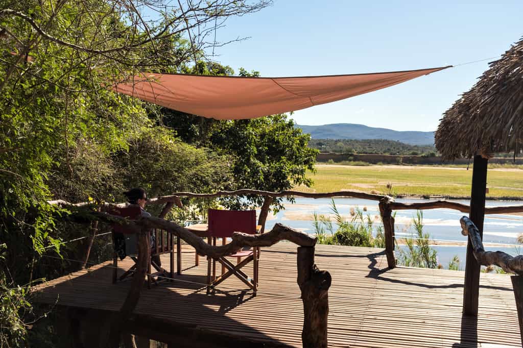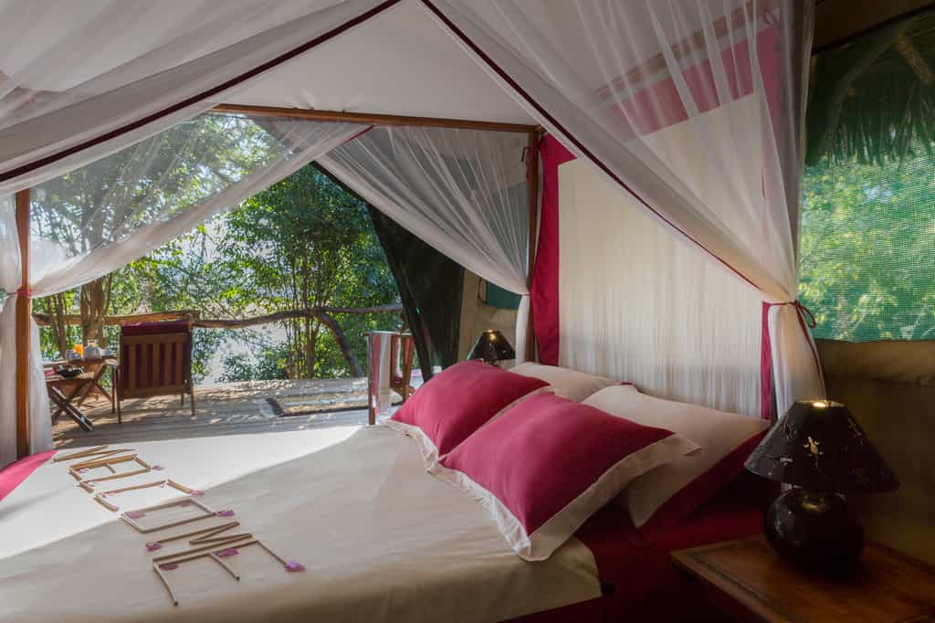 Six canvas tents on raised timber decks are spread along the riverbank beneath the tamarind trees. All have views over the water and distant mountains from their private deck. Attractive interiors feature hand-carved Malagasy furniture and vast four-poster beds, under mosquito nets, with tropical-inspired pops of colour blending beautifully with the cool natural materials. Spacious en-suite bathrooms have unusual stone walls, with bucket showers filled with hot water on request. Extra beds are available for children.