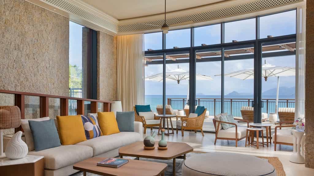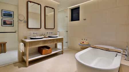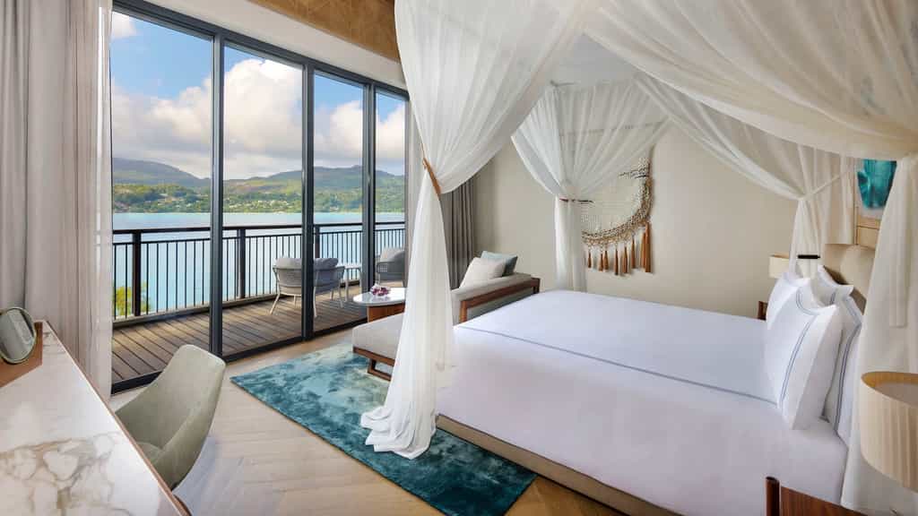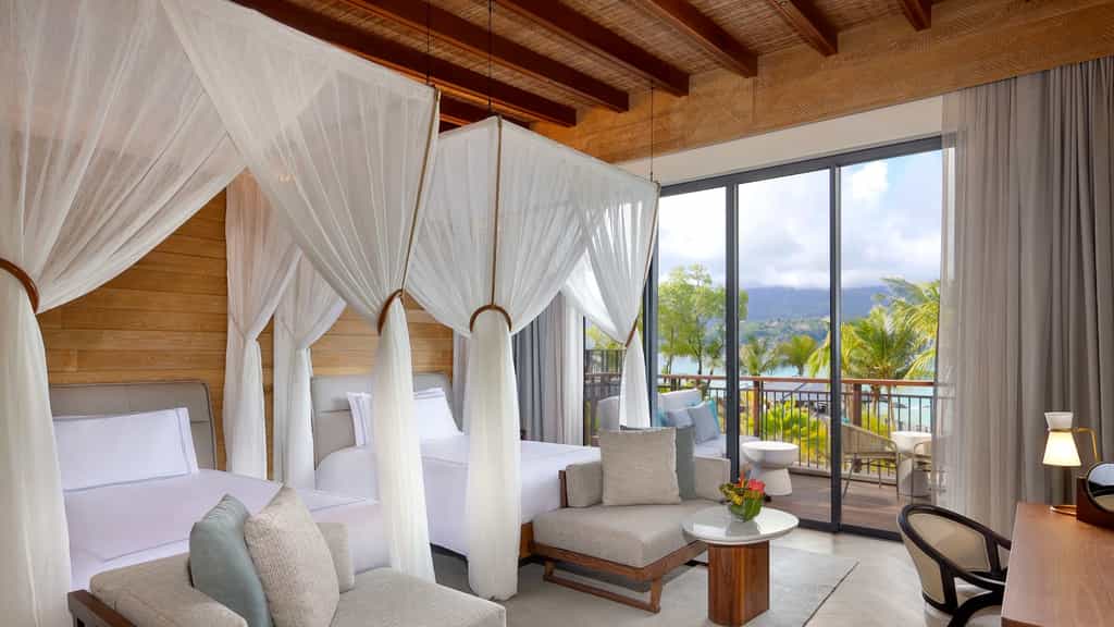 The house has a selection of 41 rooms and suites, all with king-sized beds draped in white linens and netting (and a pillow menu to boot), glamorous bathroom and private balcony with sensational views of the bay and Mahé beyond. The options range from premium rooms and suites to the three-bedroom bay house, which comes with its own plunge pool. Some also enjoy an extended sitting and dining area, as well as a terrace and outdoor daybed for those sun-kissed snoozes.