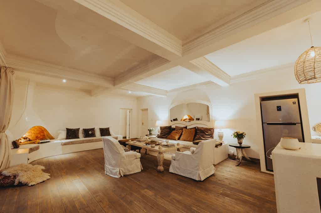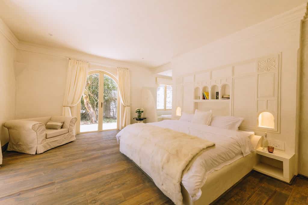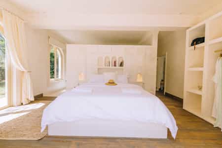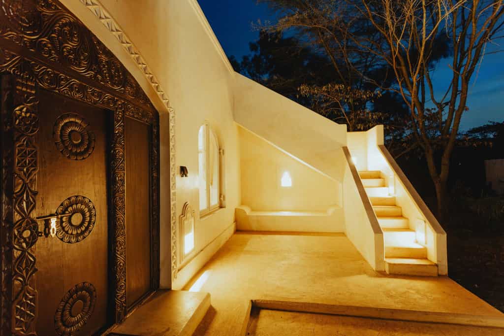 The main house has four rooms while Manzili Ndoto has two, all ranging in size from 36 to 75 square metres. The rooms have hardwood floors, cream walls with moulded nooks, and large, arched windows to let in plenty of natural light. Each room also has a dedicated outdoor sitting area with views of the pool or gardens. Storage is no problem thanks to the large open wardrobes and the bathrooms are decorated in the same understated style.