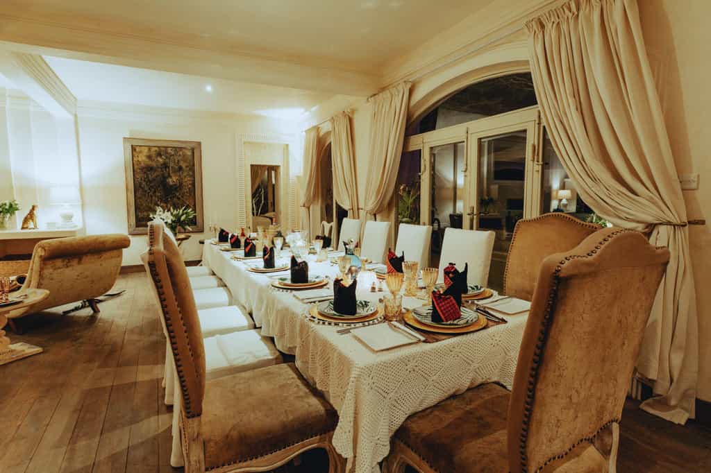 The main house and smaller Manzili Ndoto can both be booked exclusively, each of them decked out with a gleaming, open-plan kitchen and cosy lounge where the fireplace often crackles in the evenings. Manzili House also boasts a bar and elegant dining room lined with bold artwork. In between them, there is a shared plunge pool shaded by tall trees, which lead into the pretty gardens. Enjoy relaxing moments in the courtyard or on the roof for the best views.