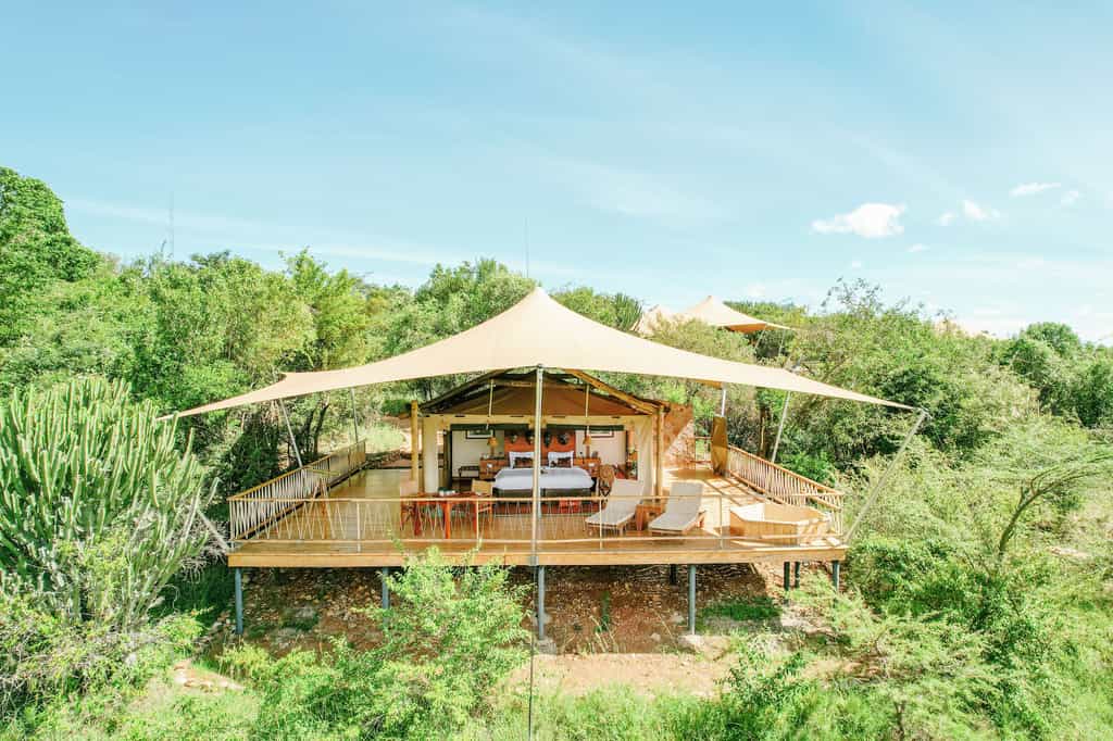Paths lead to 12 tented suites, all well spaced apart for absolute privacy. The interiors are sumptuously large, their ceilings draped elaborately and canvas side panels opening up completely to give all-round wilderness views. The largest suite has two bedrooms linked via an intimate lounge, and is perfect for families. Sheltered decks have a dining area and a comfortable lounge, and a delightful hot tub on the far edge. Bathrooms are en suite, with indoor and outdoor showers.