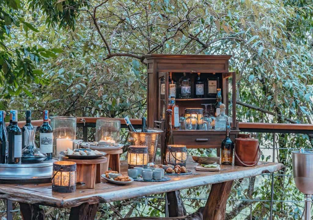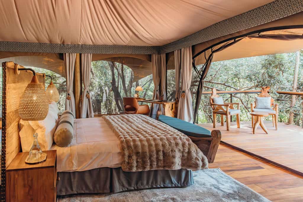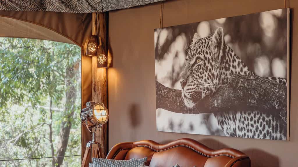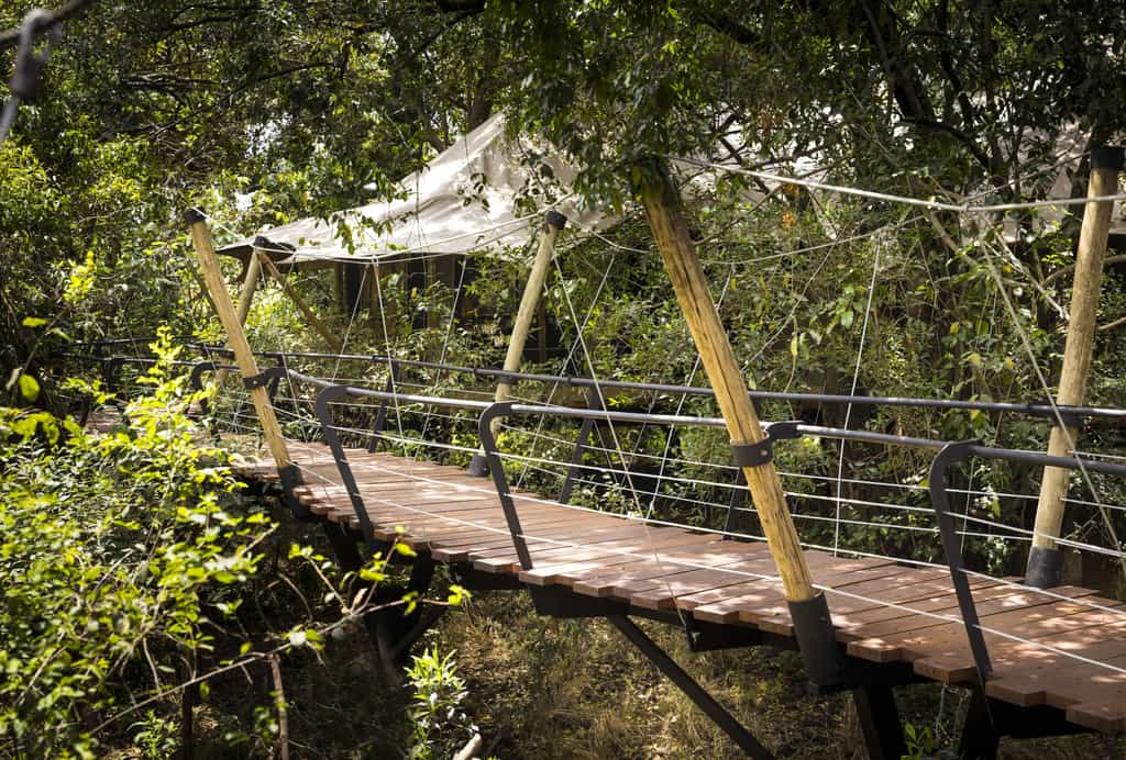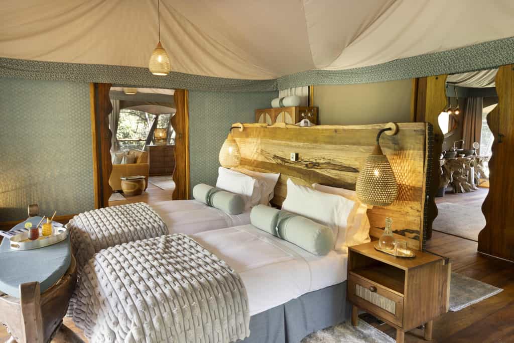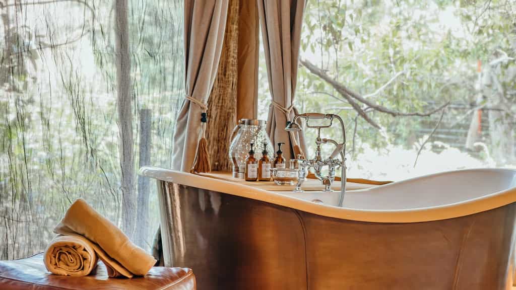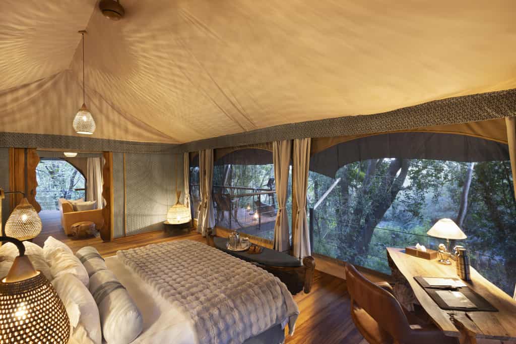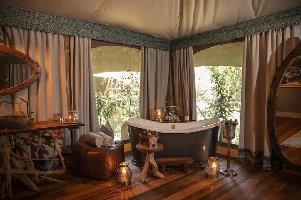 Overlooking the flowing Ntiakitiak River, the rooms are set high above the ground on elevated decks. Built from canvas and wood, they have a rustic, down-to-earth feel and feature campaign-style furnishings including a desk and comfy lounge area. The bathrooms are rather impressive, decked out with a copper bathtub, shower and double vanity areas, as well as cosy dressing gowns and a hairdryer. Each suite has its own pair of high-quality binoculars and fully-equipped Canon camera.