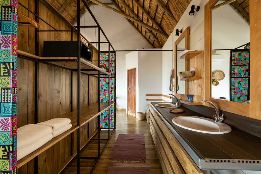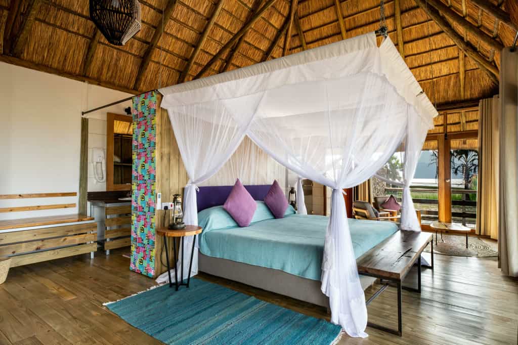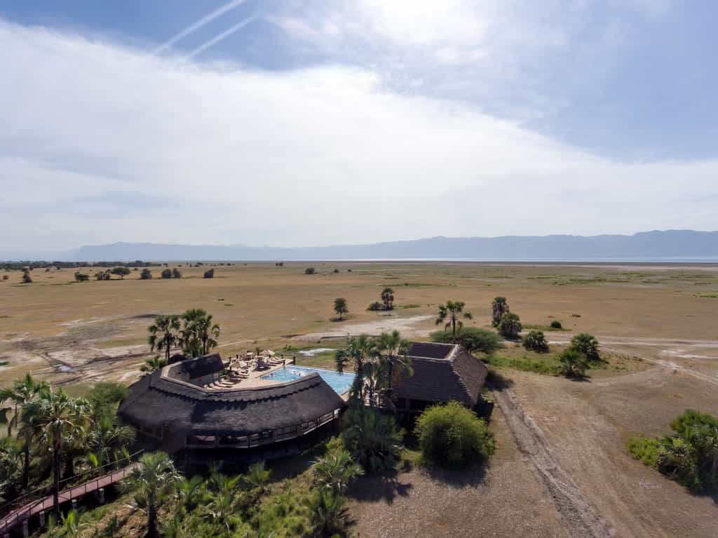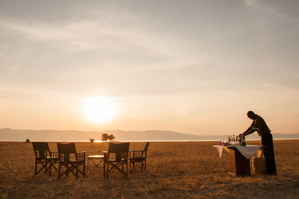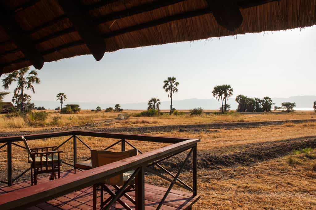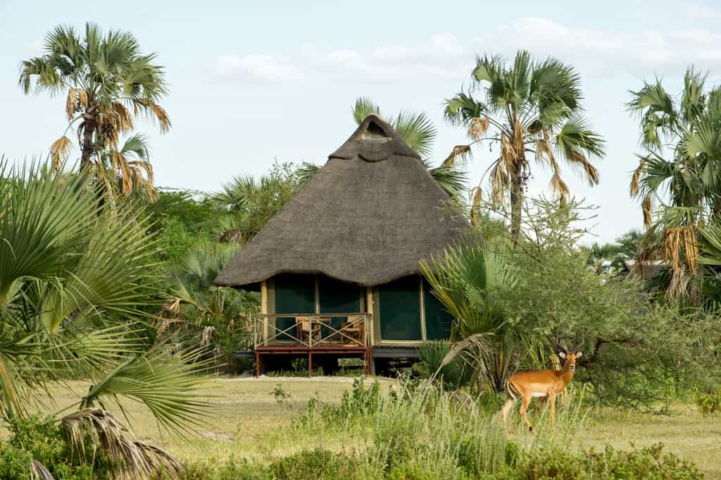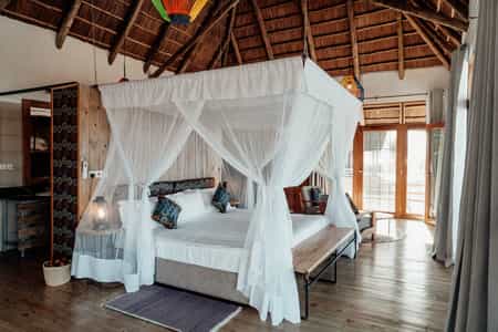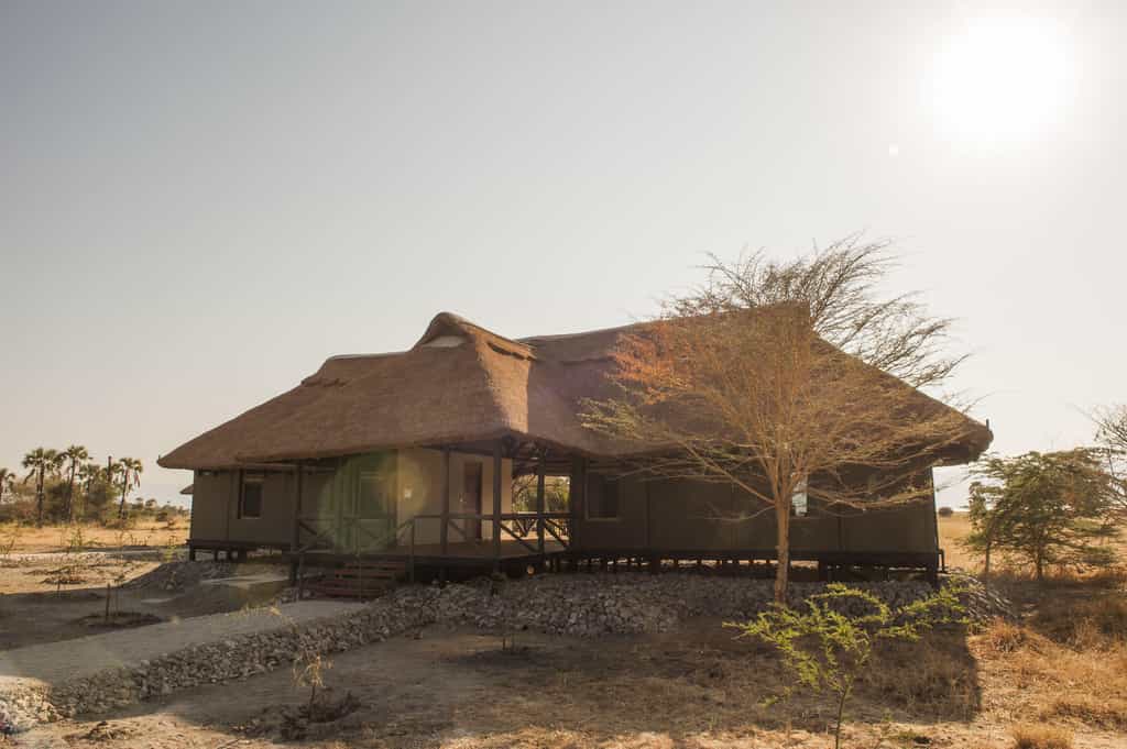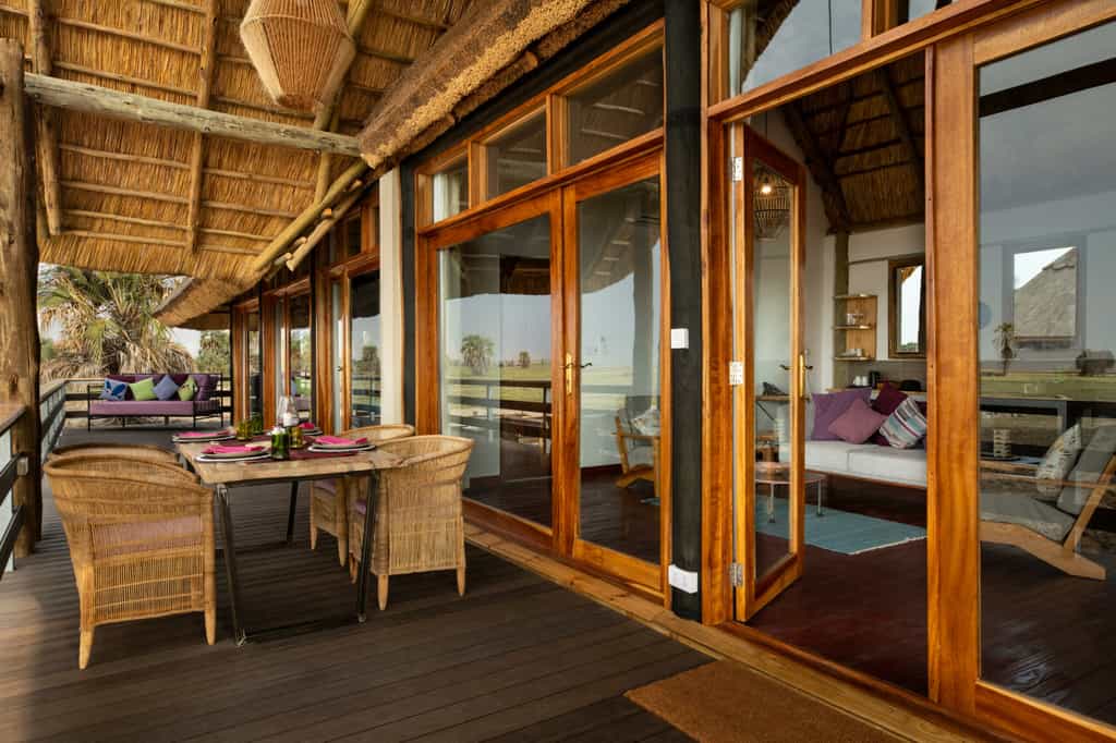 The centrally positioned main area is built and situated to make the most of the stunning surrounds. Connected by raised wooden paths and built-on raised wooden floors, it boasts views of golden grassed plains that stretch as far as the eye can see. The lounge is inviting and spacious with comfortable sofas and chairs, characterful hardwood furniture and hand-carved ornaments. Dining under swaying palms with a gorgeous view is the order of the day. Of course there’s also the ever entertaining “bush television” - the campfire with its flickering flames and stories of the wild.