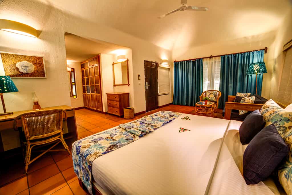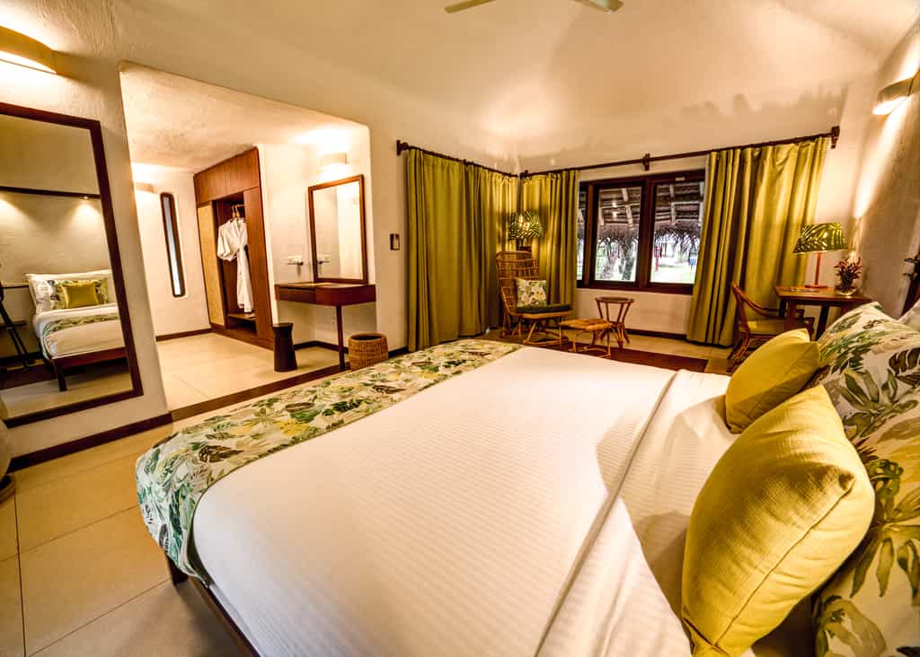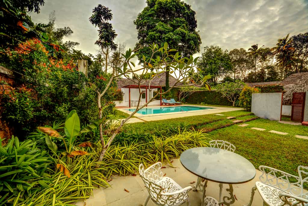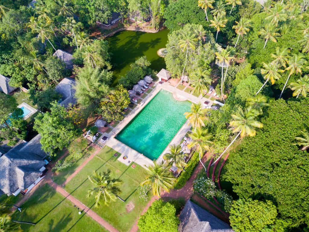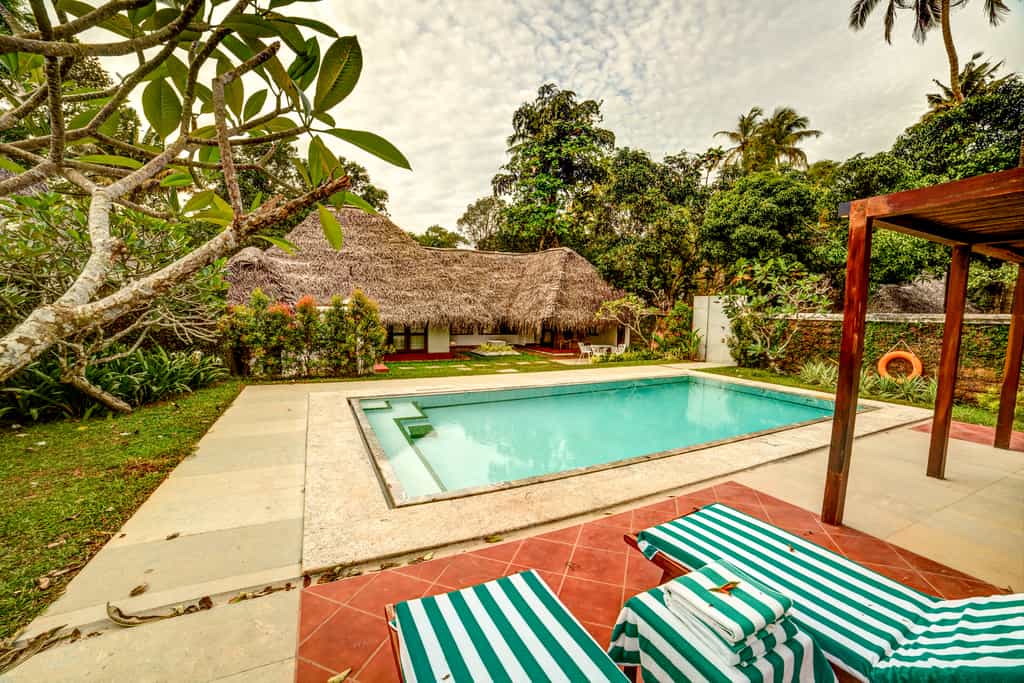 Marari has a collection of villas dotted around its 30-acre garden. Thatched with coconut palm leaves, the villas bring the outdoors inside with open-air bathrooms and scenes of nature on the walls. Decorated in shades of blue or green, each villa has a private veranda, mini bar and lounge area. A number of the cottages also come with a lovely pool in a walled garden. The Deluxe Garden Villa has a separate lounge, two bathrooms and a sitting area on the patio.