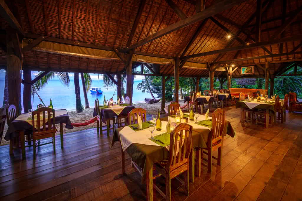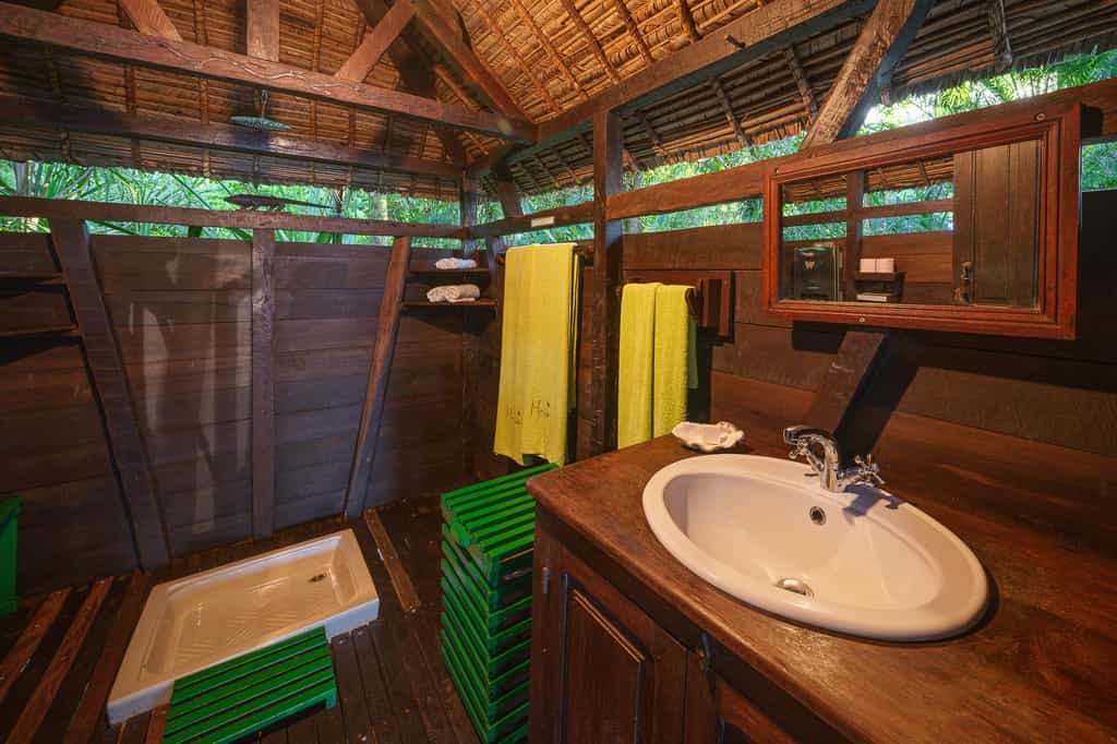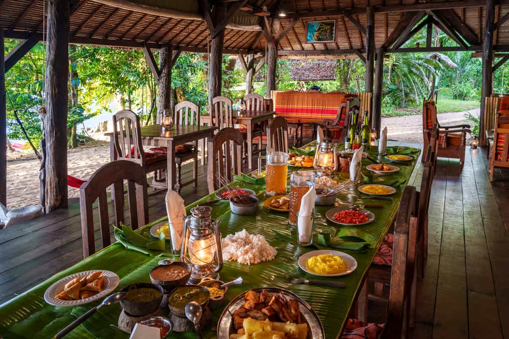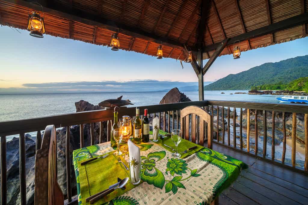 Much of lodge life takes place around the open-sided 'Beach House', where you can chill out at the lounge, grab a drink at the bar, and enjoy three-course lunches and dinners — favourites include the octopus salad and chocolate mousse with caramelised bananas. Your other choice of locale is the 'Sea Deck', overlooking a peaceful bay and providing an idyllic view to enjoy over breakfast, afternoon tea or sundowners. You can also enjoy a coconut oil massage to the tune of the lapping surf.