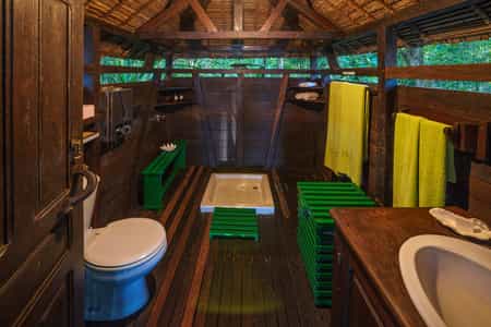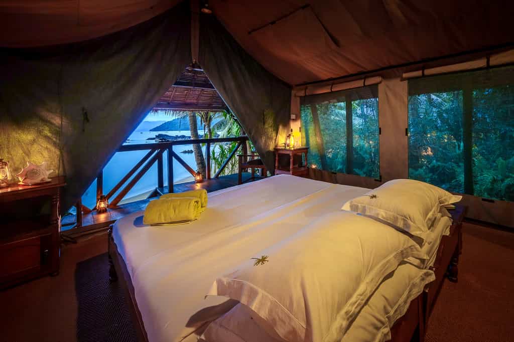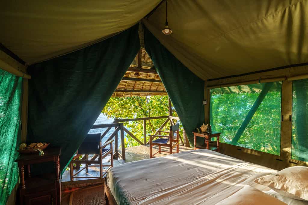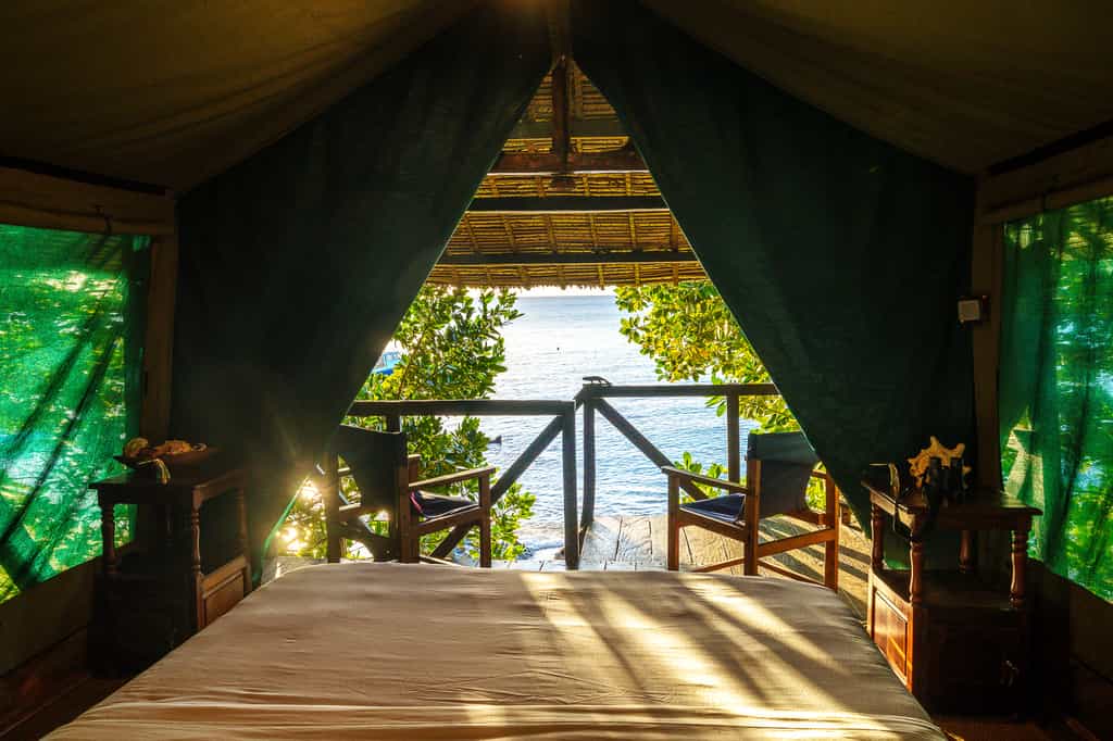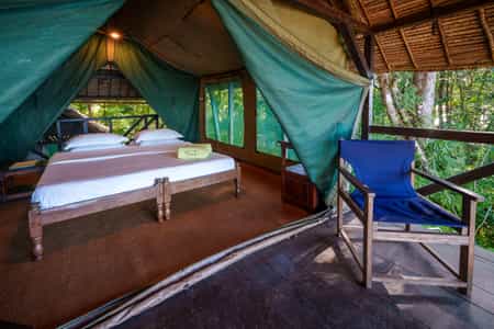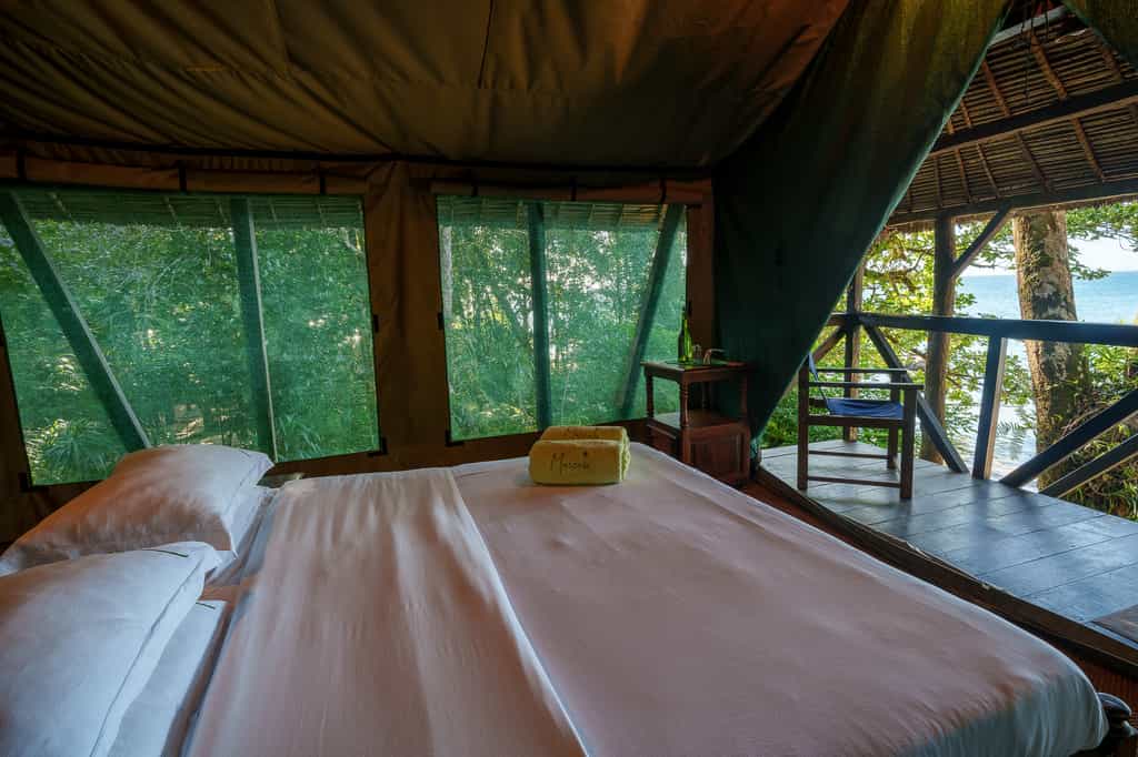 The lodge has just seven safari-style tented rooms, raised amongst the tree canopy for a real castaway feel. Inspired by traditional local structures, they are built from indigenous timber with palm thatched roofs and inside, all are simply but comfortably furnished. Netted windows allow the sea breeze to act as a natural aircon during the day and each night, you'll be lulled to sleep by the gentle waves. During a spot of downtime, enjoy idyllic views from the hammock or recline in the sitting area on the sand below your treehouse.