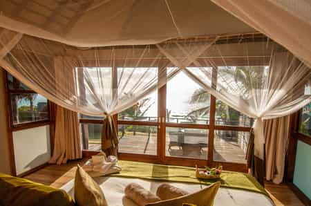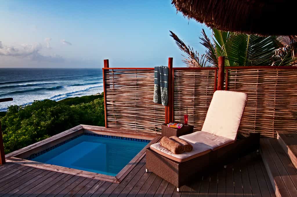 Massinga takes comfort seriously, and the sixteen ocean-front deluxe rooms all have king-size beds, comfortable armchairs and ensuite bathrooms with rain-showers, freestanding tubs and luscious toiletries. Oh, and all boast 180 degree sea views, and private decks with plunge pools. Wow. Behind the row of deluxe rooms, perched slightly higher on the hillside, but also with uninterrupted sea views, there are twelve family chalets. They have a double bedroom and a slightly larger lounge (and a sleeper couch for additional guests), though they lack the plunge pool on the deck.